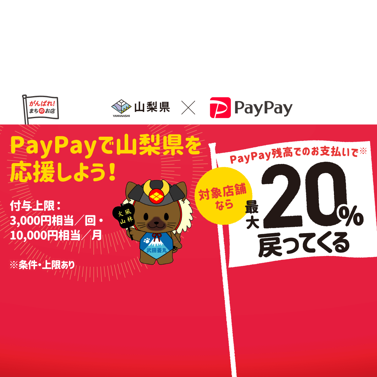 山梨県の「やまなし食のグリーン・ゾーン応援キャンペーン第一弾」として12月1日から1月31日(予定)の期間中、QRコード決済サービス「PayPay」を使い山梨県内のグリーンゾーンを実施している飲食店を利用すると、決済金額の最大20%相当のPayPayボーナスが付与されるポイント還元キャンペーンが実施されます。