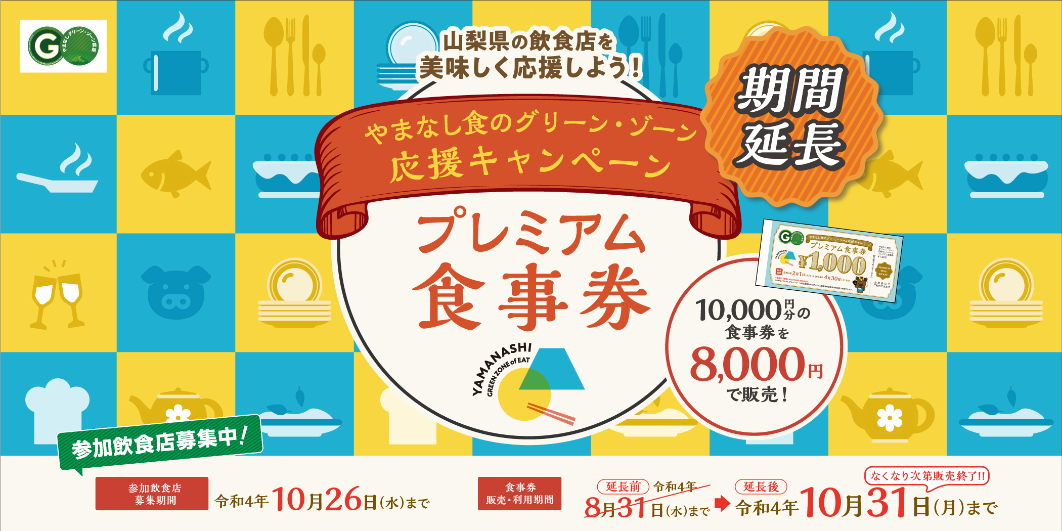 山梨県では現在「~やまなし食のグリーン・ゾーン応援キャンペーン~プレミアム食事券」が開催されています。今のところ10月31日までご利用いただける予定です。食事券の販売店はエリソンのある峡東地域では郵便局が窓口となり、平日のみの販売となりますのでご注意ください。遠方の商業施設などでは休日のご購入ができる窓口もあります。