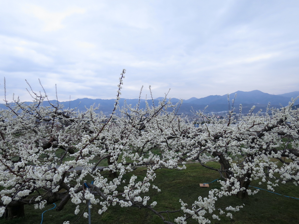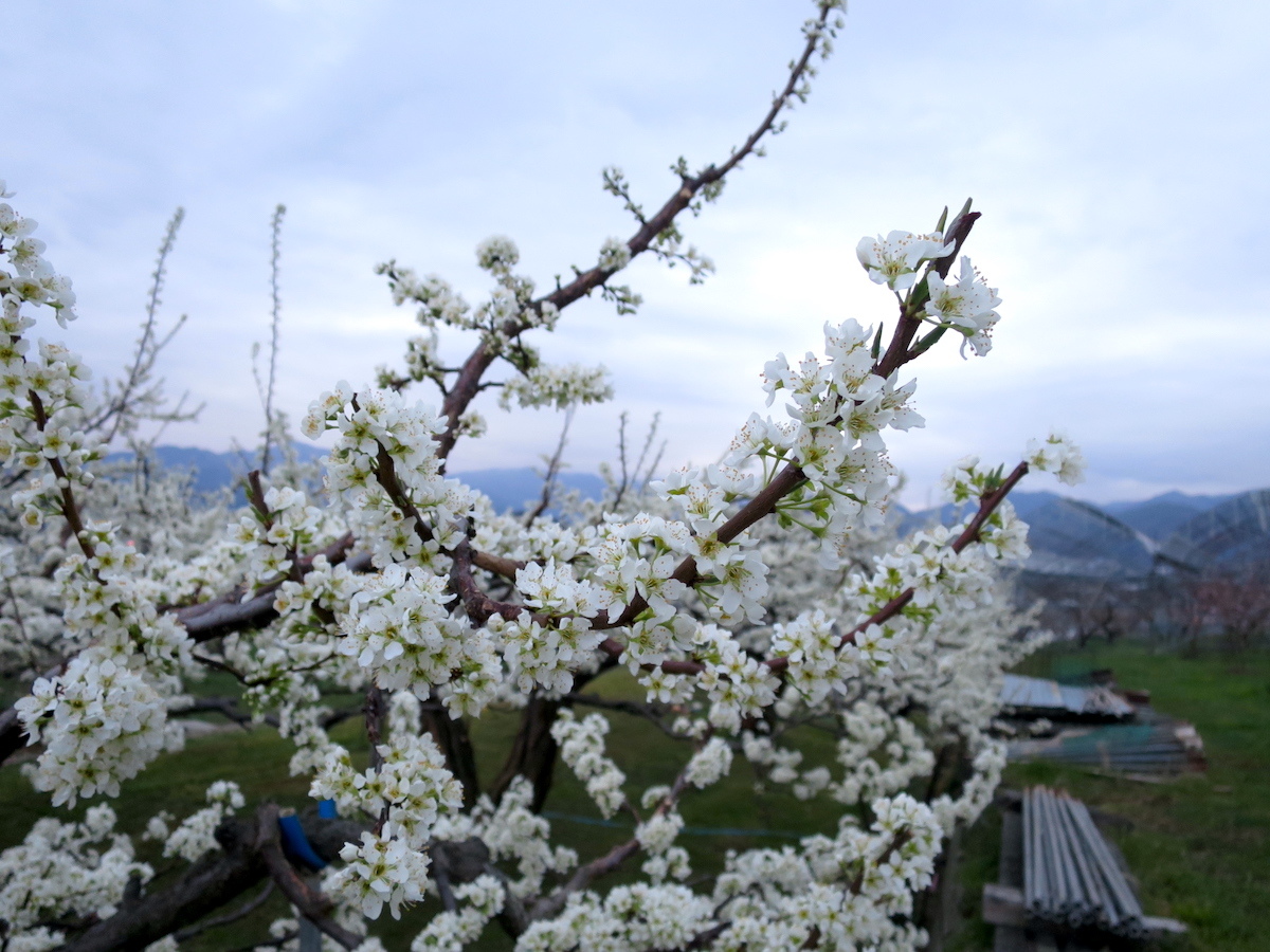 周辺の果樹の花の様子も見てきました。桜より少し先に咲くスモモの白い花は満開を迎えています。