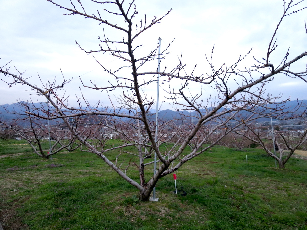 同じぐらいの標高の桃の樹はまだ蕾です。今週末に桃のお花を見たい場合は石和や春日井あたりの標高低めのエリアが良さそうですね。塩山や笛吹市の山側では来週末までが見ごろになりそうです。