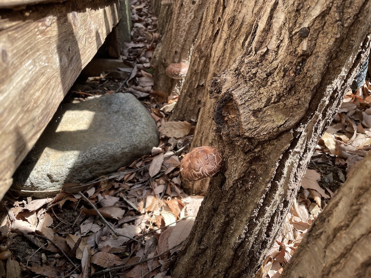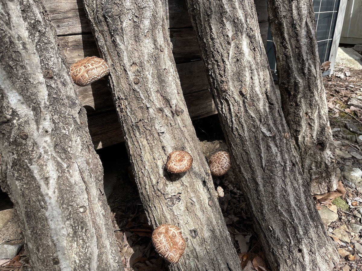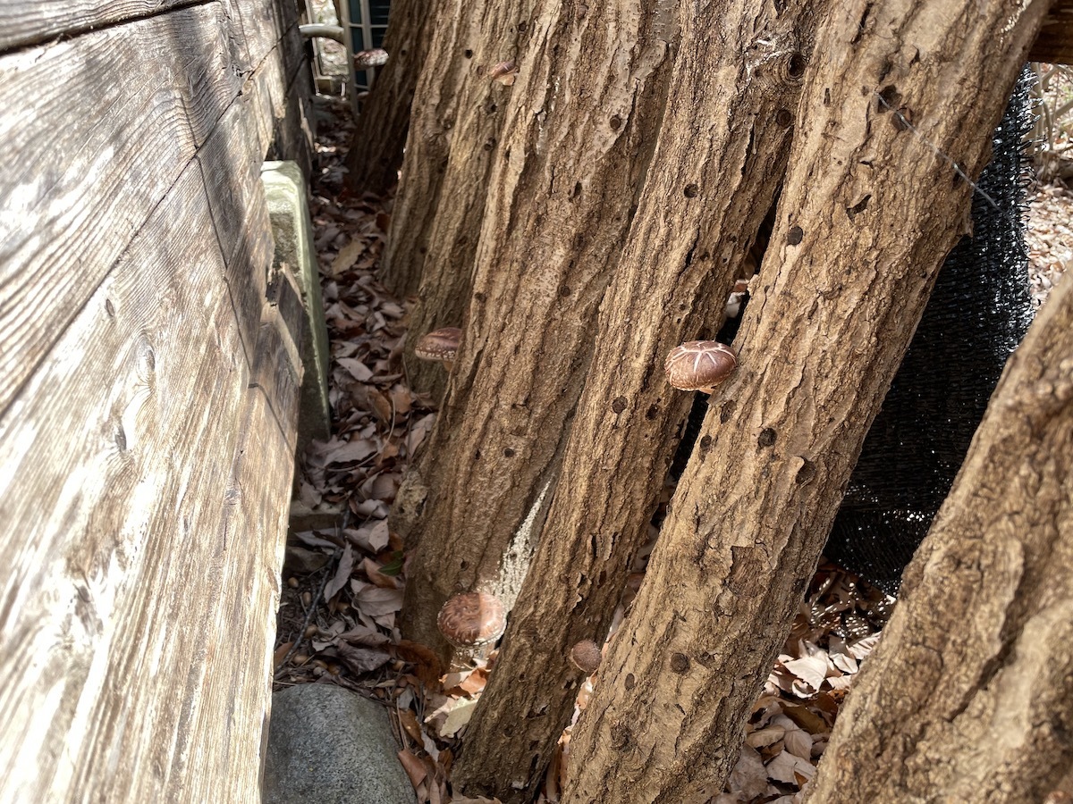 ここのところ数日おきに雨が降るのでいい感じに原木からしいたけが出てきました。しいたけは秋だけではなく春にも出るんです。