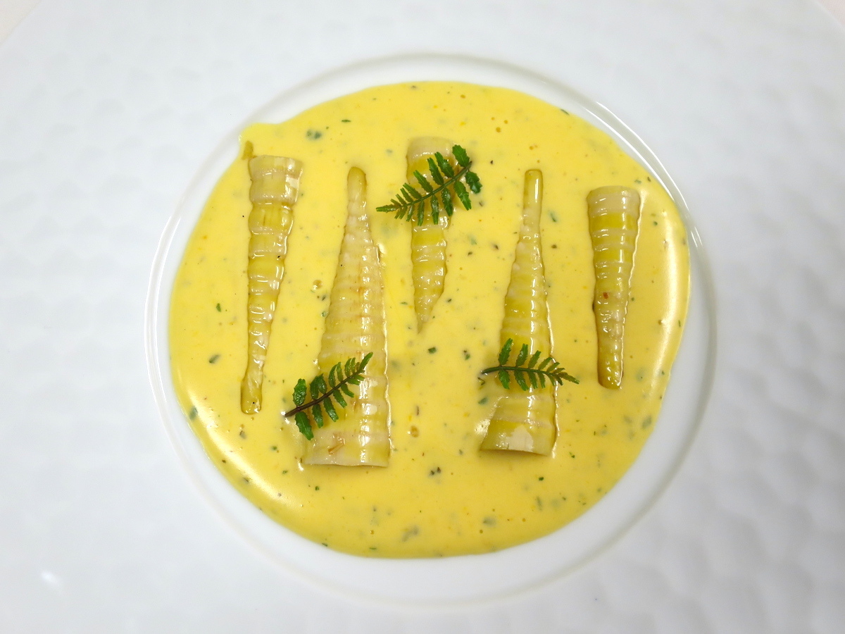 先日ご紹介した庭のたけのこです。香りと甘味があるたけのこに添えたのはフレンチの王道「オランデーズソース」刻んだ木の芽を加えたオランデーズソースは卵とバターのコクがありながら酸味もあって重過ぎない味わいです。