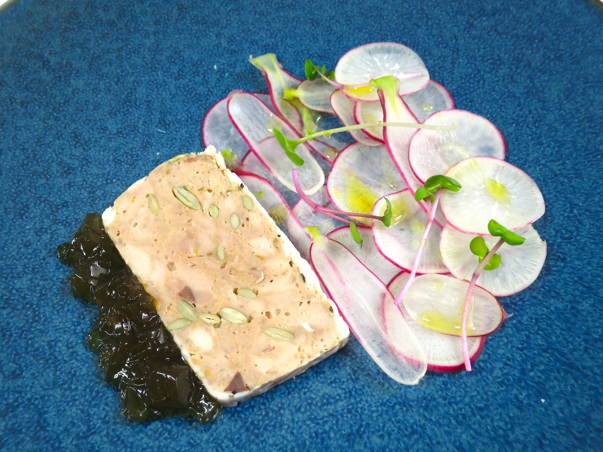シェフが撃ったキジを使ったテリーヌです。あっさりとしていながら旨味が広がる味わい。ジビエ類の出汁を使ったジュレと自家菜園のラディッシュと共にどうぞ。