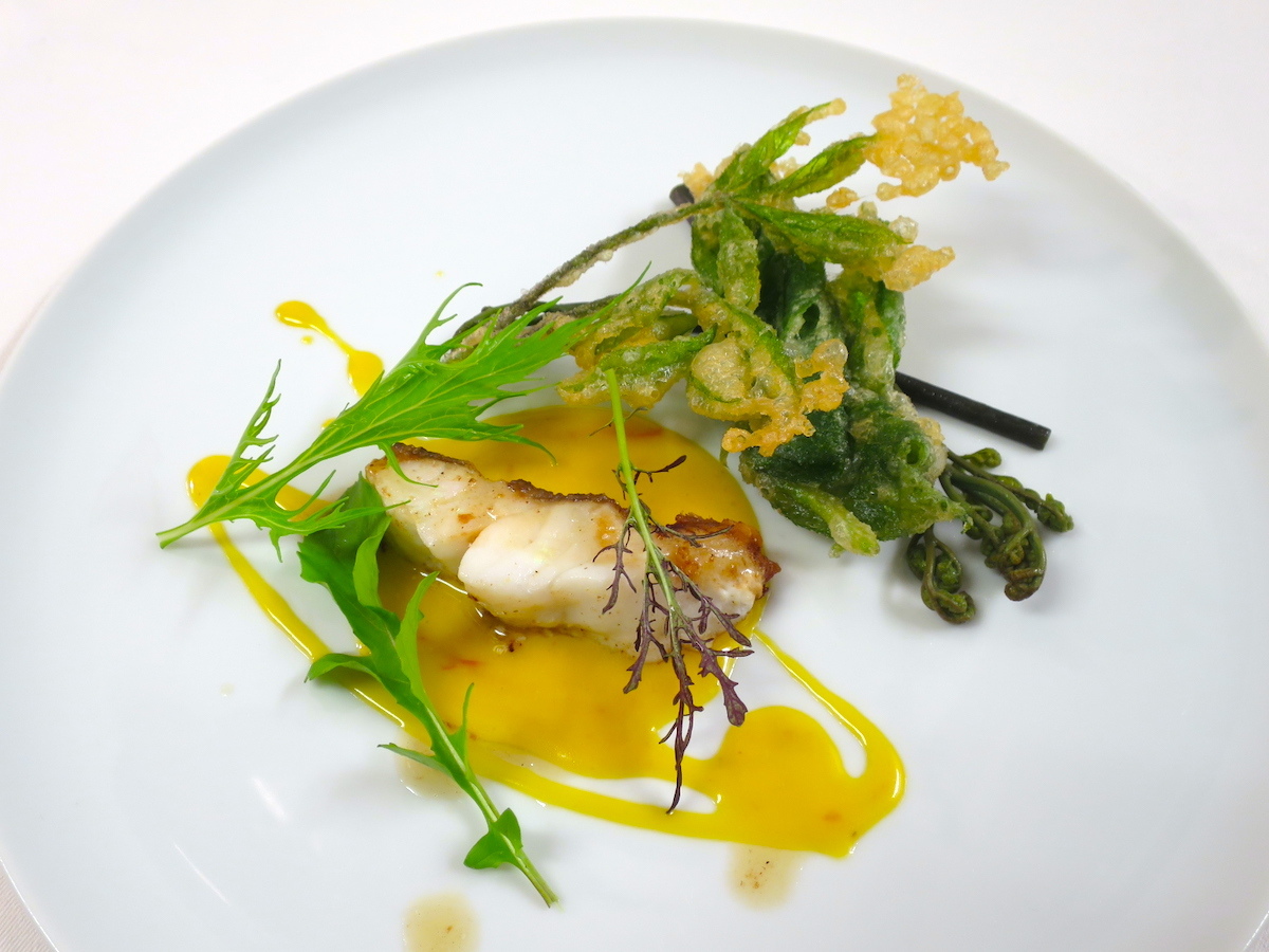 そろそろ山菜も最終盤に差し掛かっています。皮目をカリッとポワレした大分県産のキジハタにはサフランのソースとワラビ、コシアブラ、オオバラを添えて。
