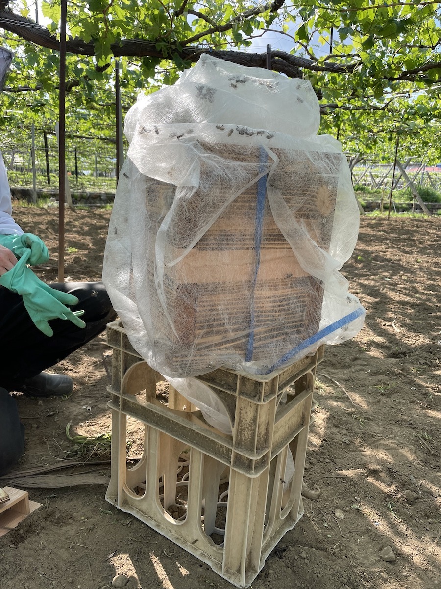 これを巣箱に近づけて中に入るように促します。みつばちは薄暗いところが好きなので落ち着いてくると自然に中に集まり始めます。