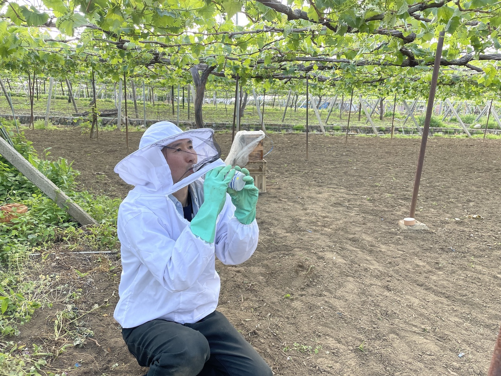 ところが急転直下!勝沼の知り合いから「葡萄畑にみつばちが集まってるよ!」と教えてくれたんです。わわわっ分蜂だ!捕獲に行こう!と慌てて巣箱などを車に積み込み駆けつけました。