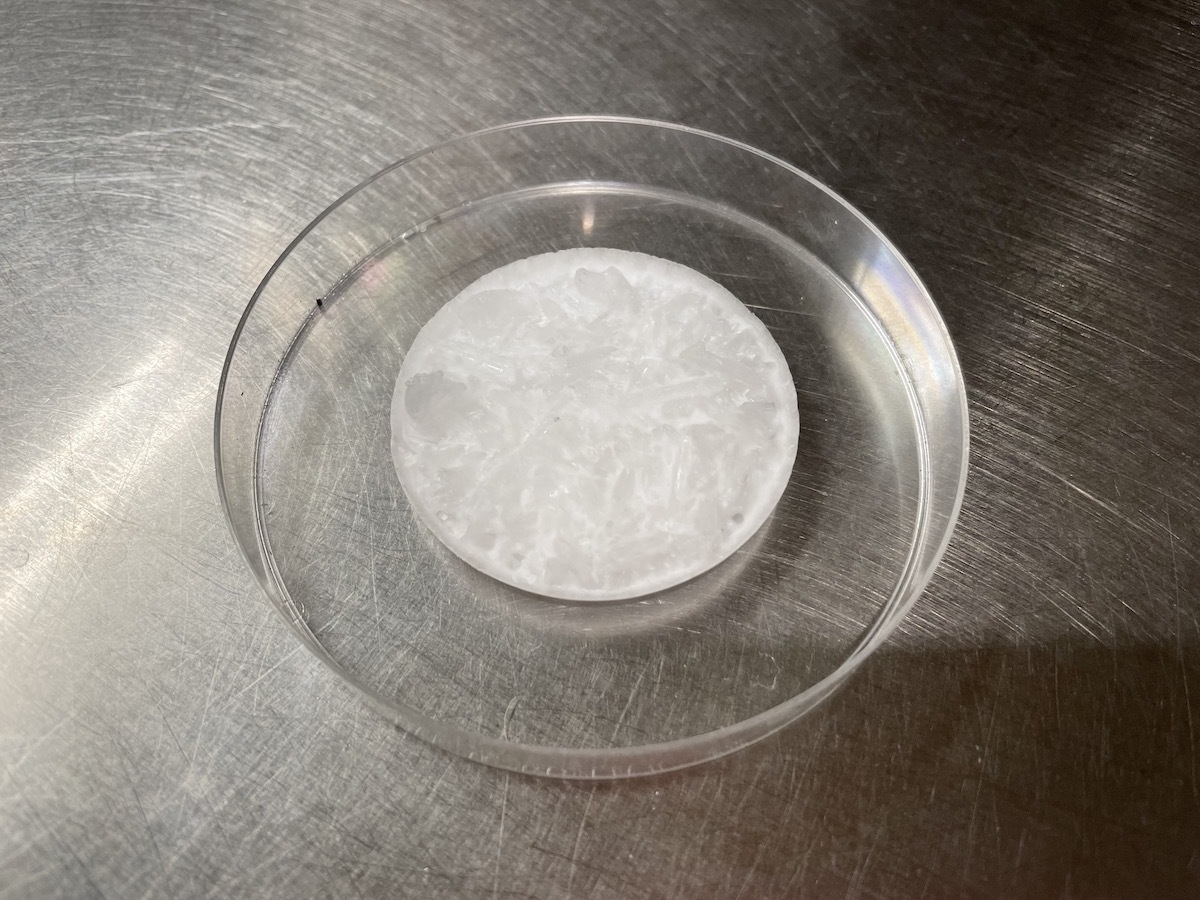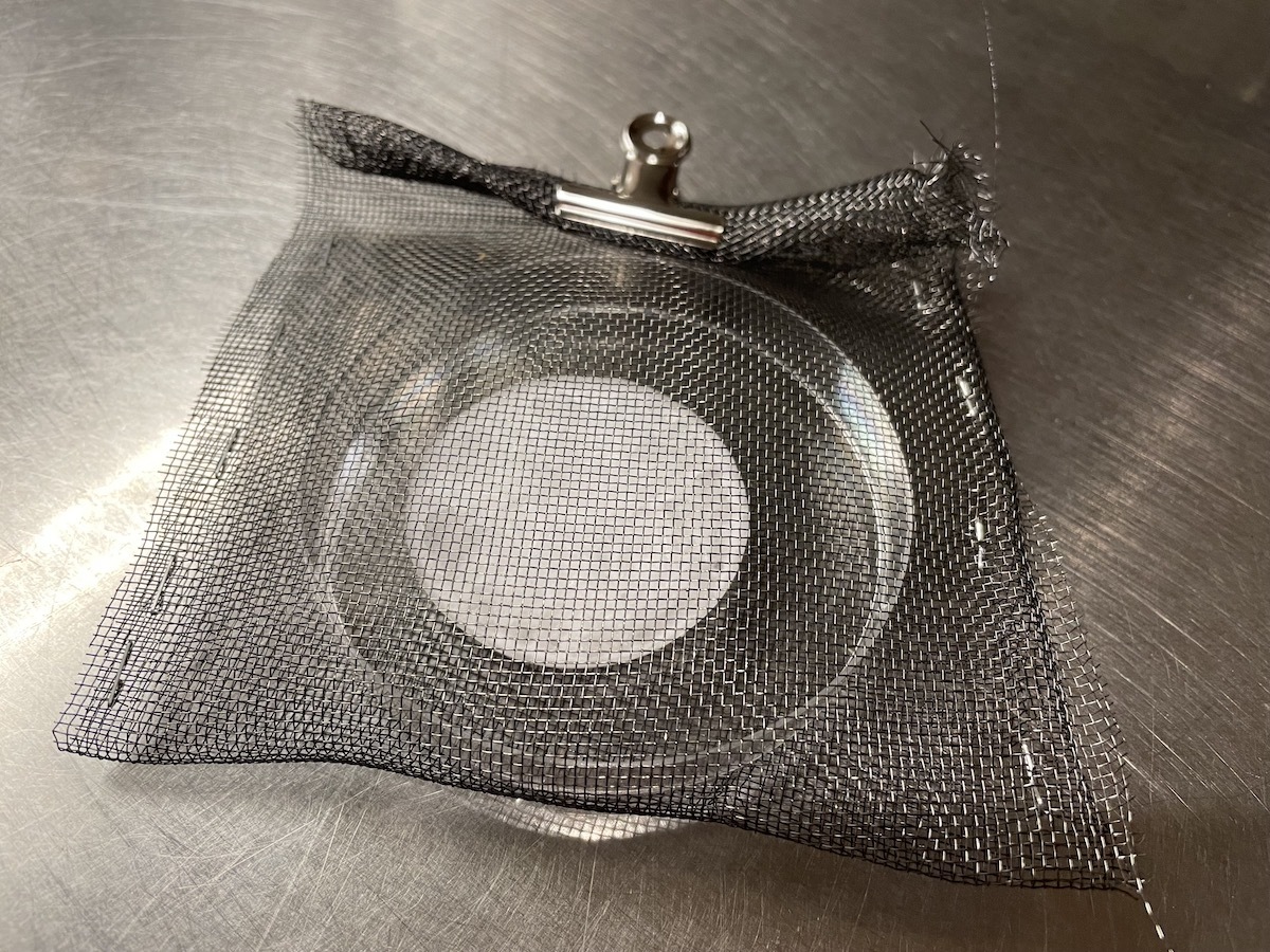 小さな結晶状のメントールを湯煎で溶かしタブレット状にしました。プラ容器に入れて蜂に触れないようにネットで包みました。常温で徐々に昇華していくので巣の上部に設置します。