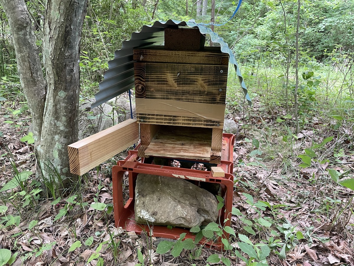 庭の一角にこんな感じで設置してある巣箱。捕獲してきた後は定着するまであまり刺激しないように遠巻きに様子を見ていました。それなりに蜂の出入りがあるのでとりあえず巣作りに励んでいる様子。