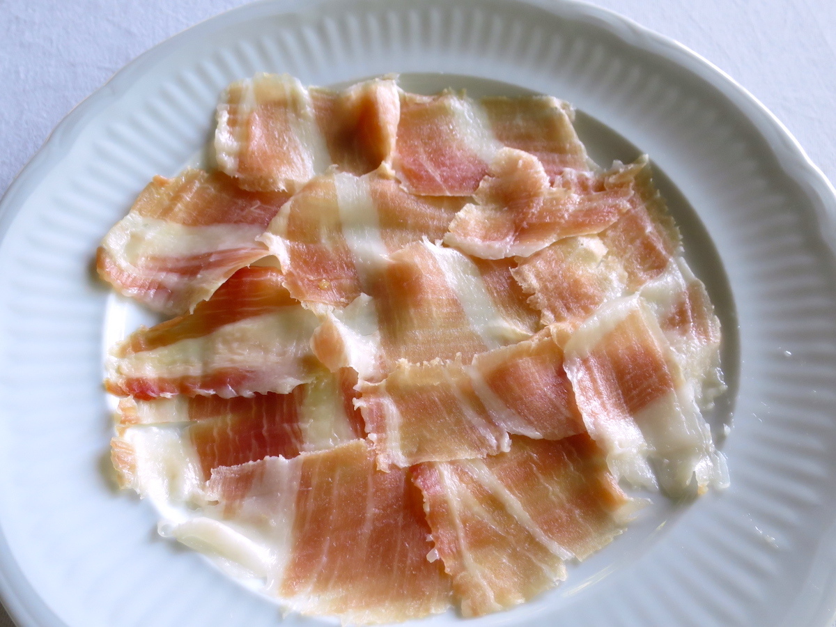 しなやかな舌触りと丸みのある塩味、熟成された香りと旨味を感じます。今年も無事に美味しくできました。よかったです。骨付きもも肉二本分作ってありますので晩秋ごろまでご提供できると思いますのでお楽しみに!コースメニューに使用していきますが、必ず食べたい方はメニューに組み込みますのでご予約時にリクエストして下さいね。