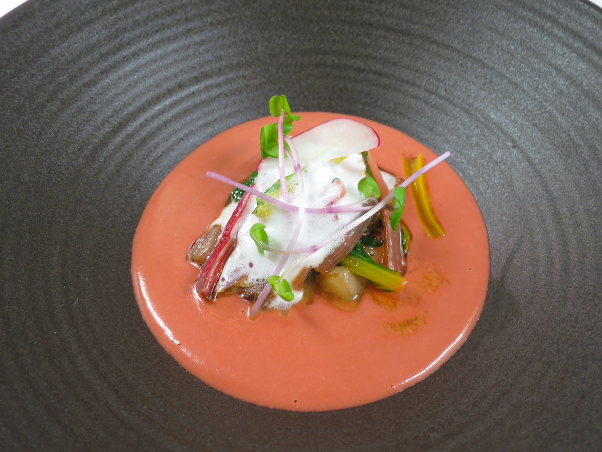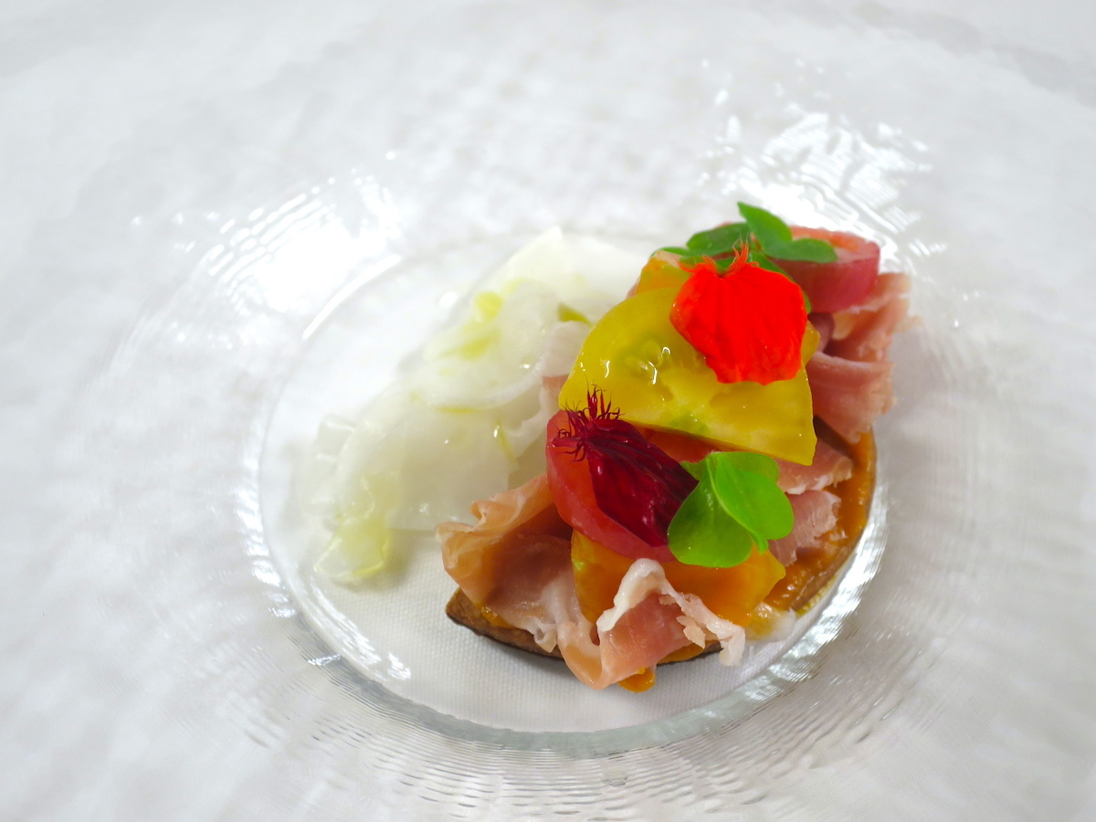 先日のワイン豚の自家製生ハムです。サクッと焼いた生地の上にトマトソースと共に盛り付けタルトレット仕立てにしました。地元産のカブのハチミツとワインヴィネガーマリネを添えて。