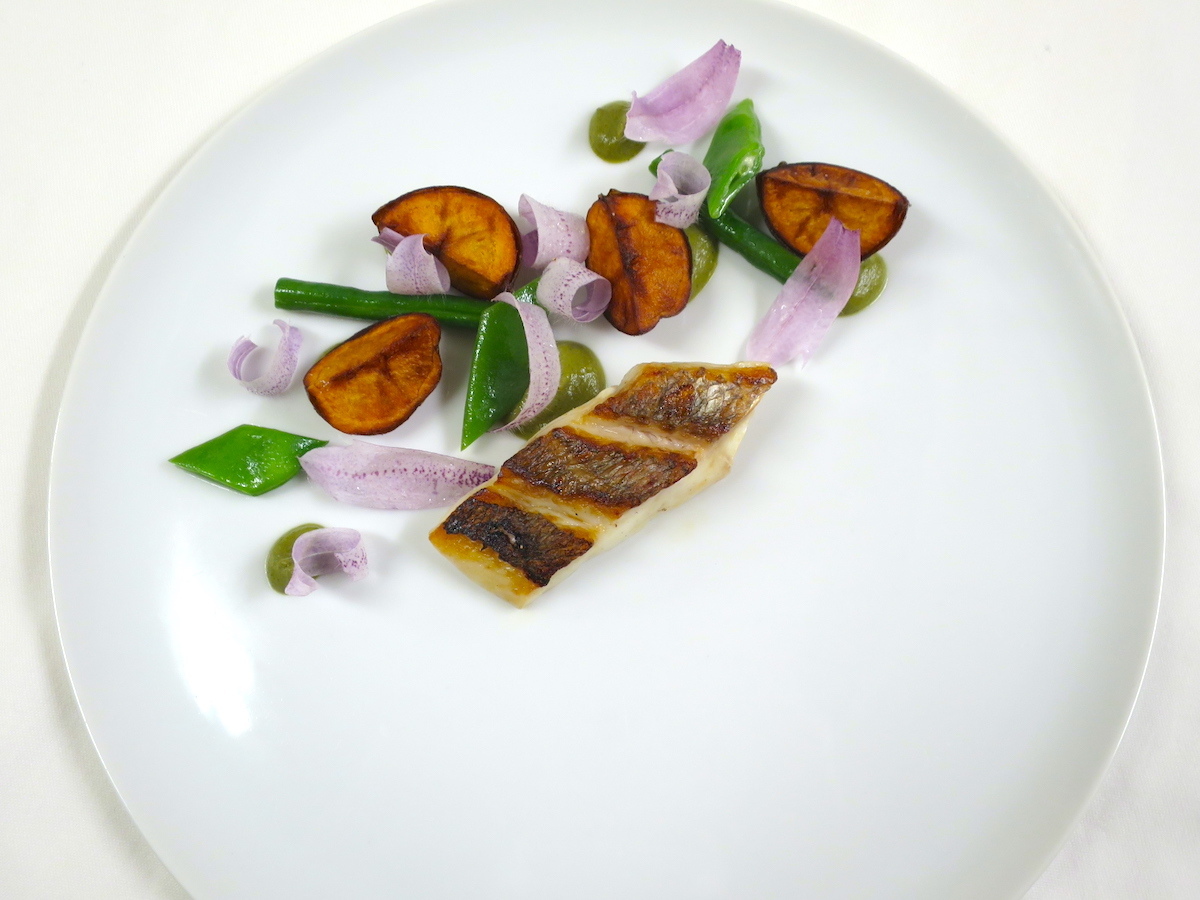 明石産の天然物真鯛のポワレ。自家製アンチョビを使ったグリーンタプナードソースです。庭で咲くホタルブクロの花の彩りで。
