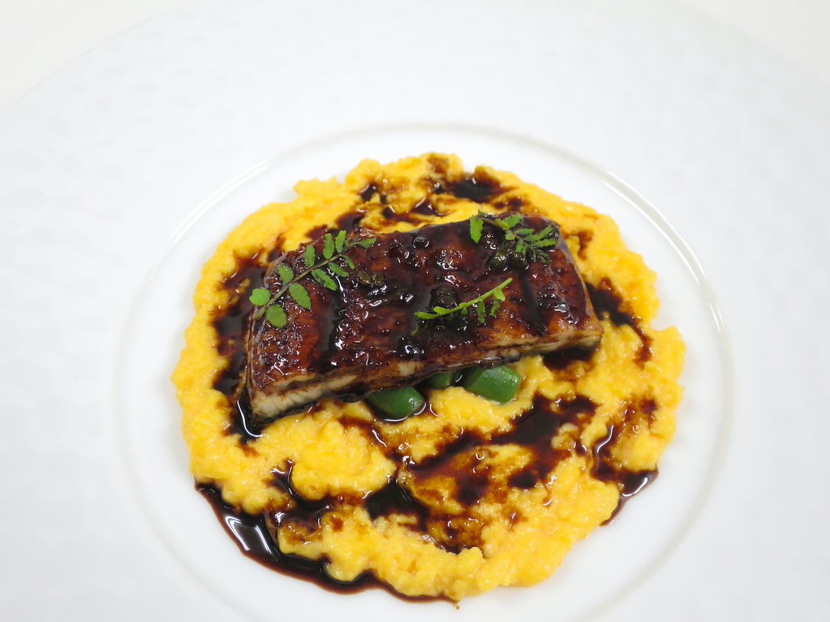 山梨県産のうなぎのお料理です。極甘口シェリー「ペドロヒメネス」の独特のコクのある風味でブレゼしたうなぎを黒富士農場の卵のトロトロスクランブルエッグと共に。夏に元気の出る一品です!