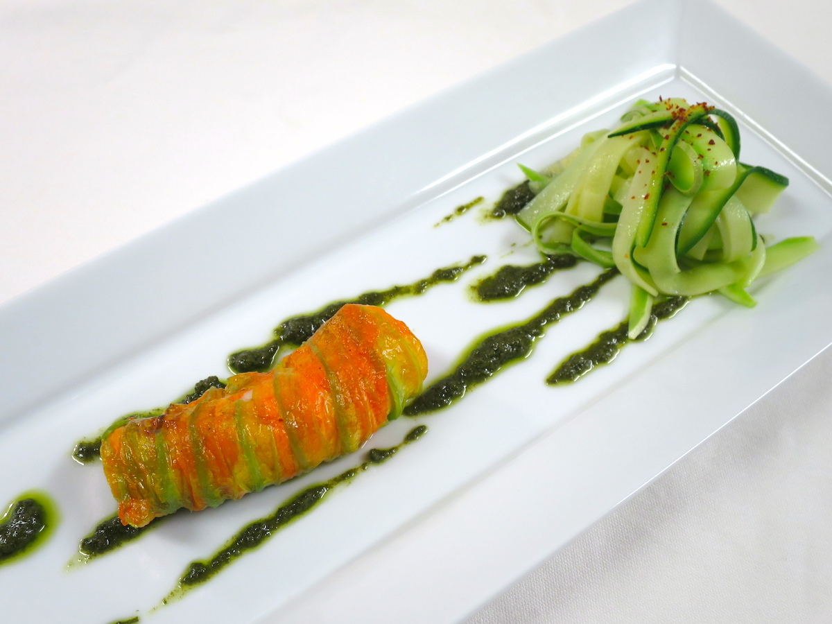 自家菜園で採れたズッキーニの花を巻いてローストした徳島県産のコチです。コチはプリッとした歯ごたえで旨味のある夏の白身魚の代表格ですs。バジルソースでさらに夏らしい一品になりました。
