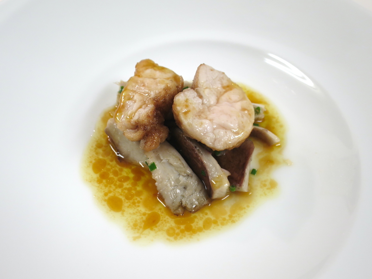 仔牛のリ・ド・ヴォー(胸腺)と天然きのこ「マツオウジ」のソテー。そろそろ夏のきのこの季節が始まるので森の様子が気になる今日この頃です…