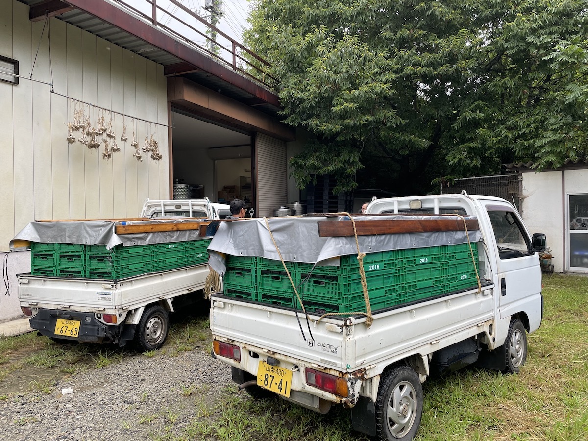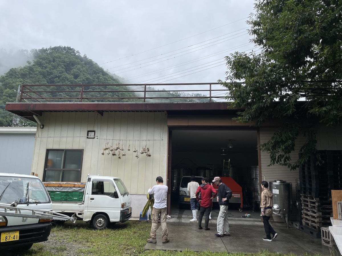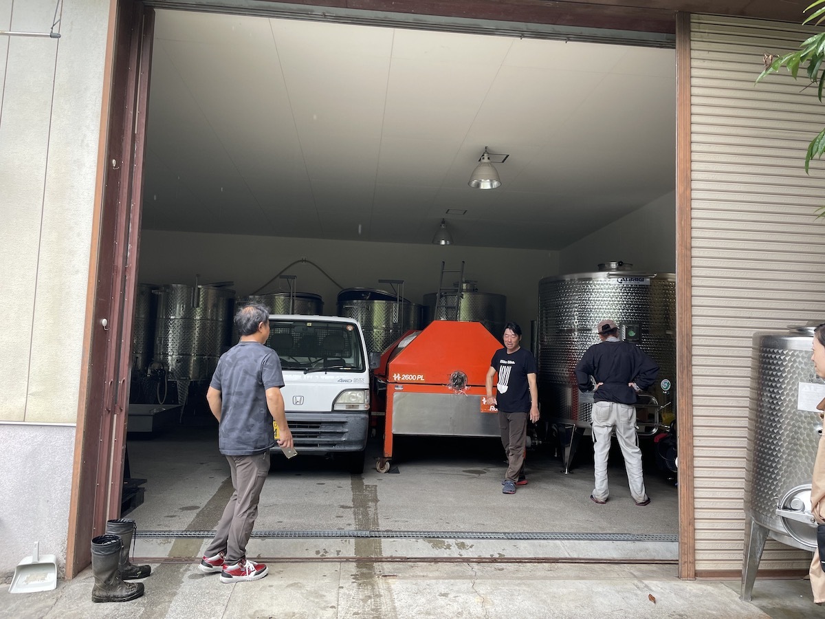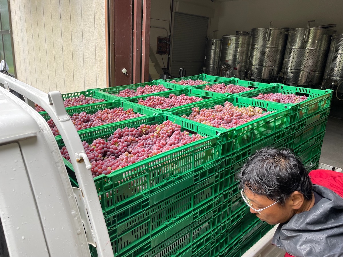 ドメーヌ・オヤマダ今季初収穫 ペイザナ中原ワイナリー 2022.08.17 日曜日のドメーヌ・ポンコツの収穫に続いてドメーヌ・オヤマダの1回目の収穫も行われました。今日少し量が多かったようで前回よりも遅め、ヤギのための朝の草刈りが終わった頃に帰ってきました。 合計で軽トラ3台分かな?これぐらいならプレス機に一回で楽々入りますね。一日の量が多くなってくると複数回プレスする時もあります。ホールパンチは除梗破砕してから絞るよりも時間がかかるのでそういう時は夕方までかかります。 プレス機に軽トラ横付けからの直投入です。 今日は共栄堂の小林さんも助っ人に。初日の収穫はいつもお互いに手伝いに行くそうです♪