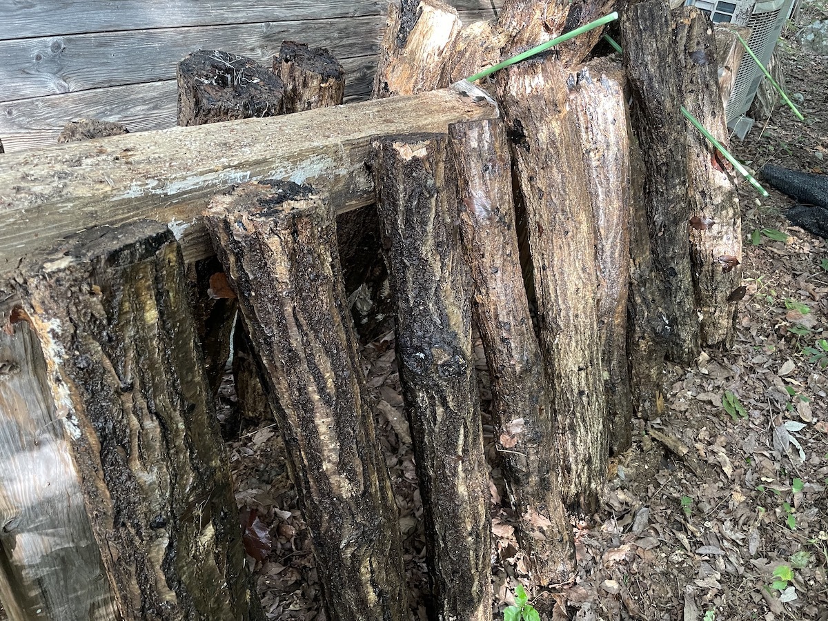 そして翌日引っ張り上げて少し間隔をあけながら並べます。陽が当たりすぎないように木陰に置くか日除けをかけてあげると良いですね。あとは一週間から10日ほど経つと採りごろのしいたけがニョキニョキになるはず♪