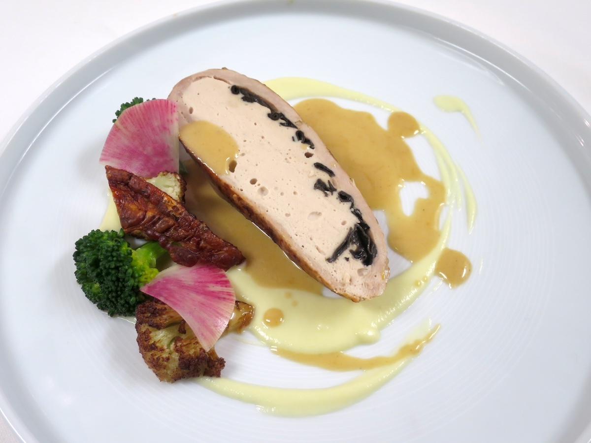 キジのファルシー。キジの胸肉にササミのムースとシェフが採ったトランペット茸を詰めてローストに。