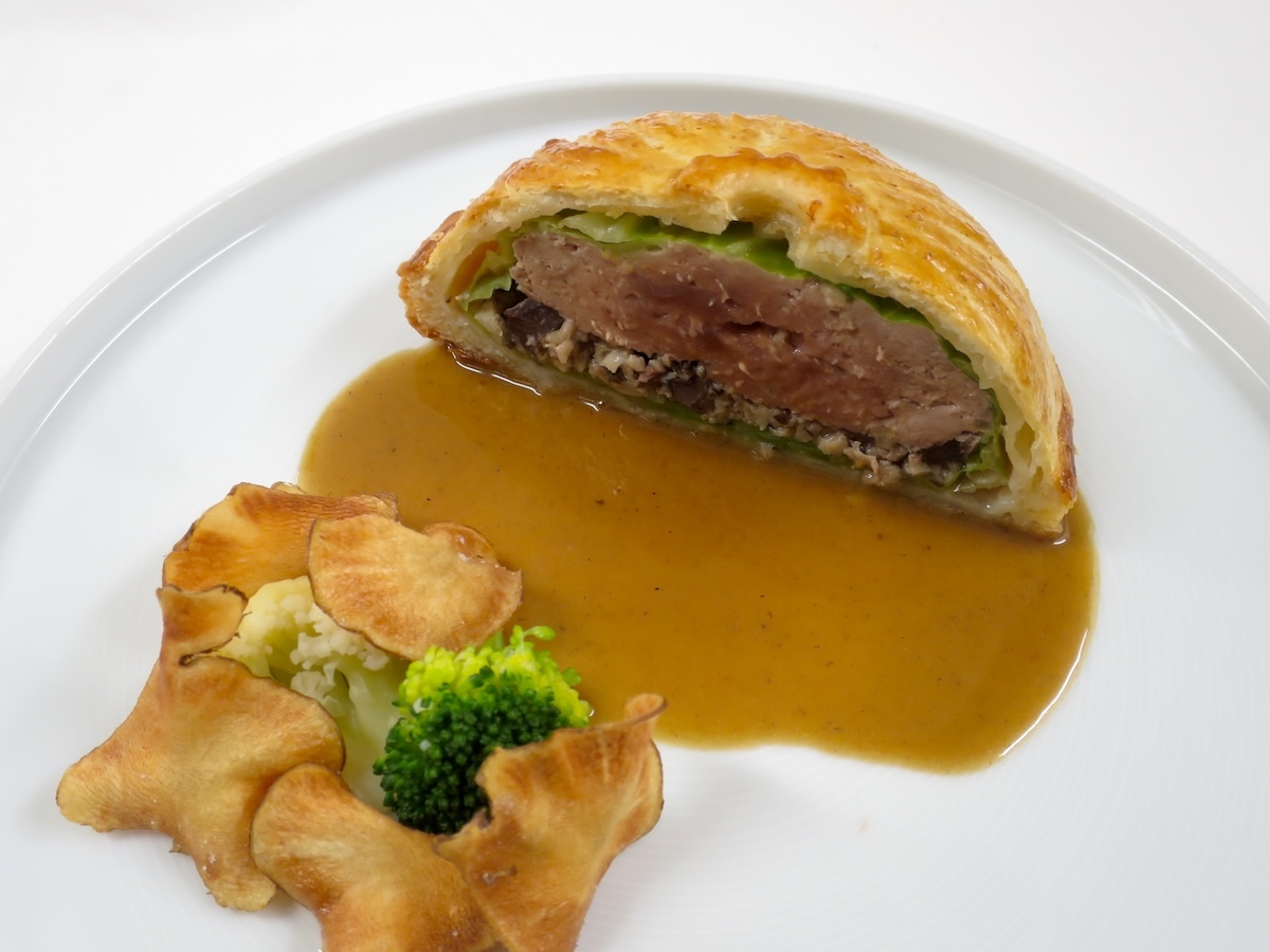 キジのパイ包み焼き。キジのもも肉を挽肉と角切りにして原木椎茸とキジの内蔵と共にパイ包み焼きに。