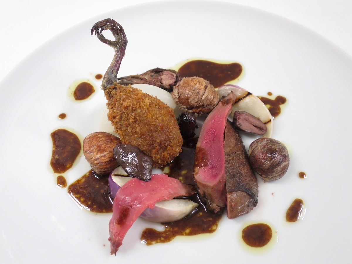 キジバト胸肉のロースト、モモと手羽のメンチカツ仕立て。キジバトの内臓類と季節の野菜も添えて。