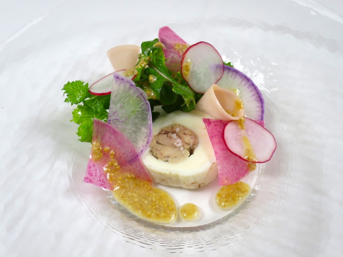 旬のウマヅラハギの肝の周りに身をムース状にしたものさらに薄切りの身で包んで蒸し上げてから冷やしました。
