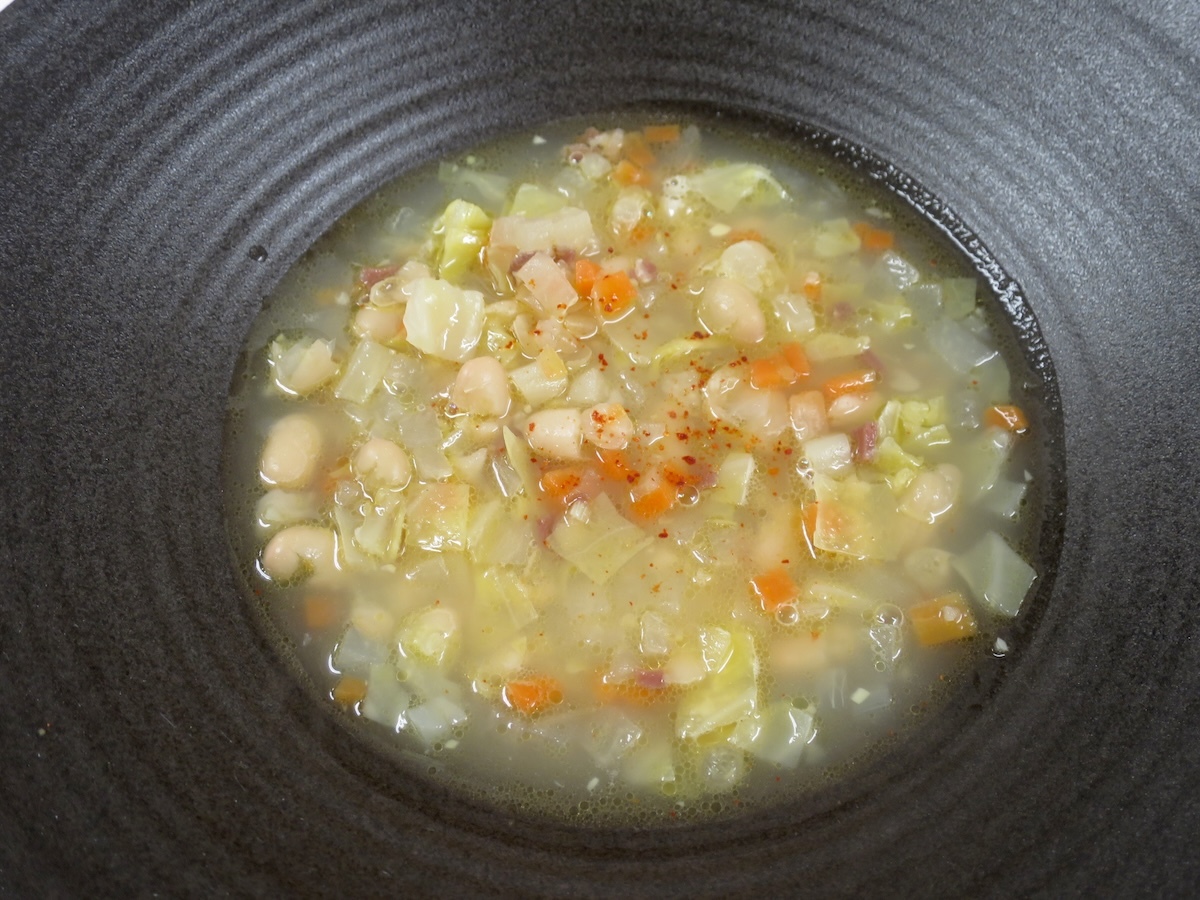 身を削り取った後の自家製の生ハムの骨を使って出汁を取ります。その旨みたっぷりの出汁に刻んだ生ハム、白インゲン豆、刻んだ野菜を入れたバスク地方風の滋味深いスープです。