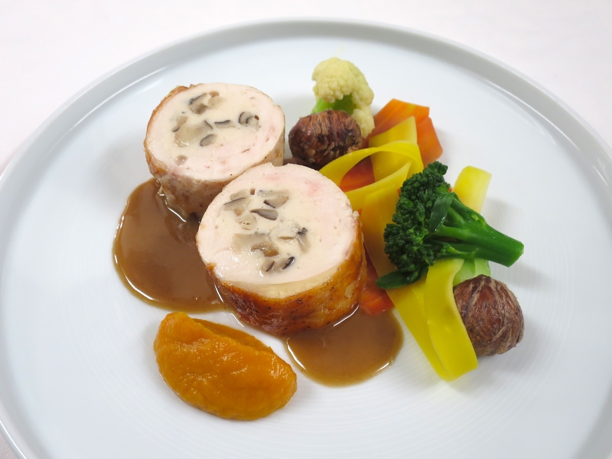 鶏むね肉の中に鶏のムースと原木しいたけを詰めてしっとりと低温調理した後に表面を香ばしく焼き上げました。地元産の色とりどりの人参をはじめとした季節の野菜を添えて。