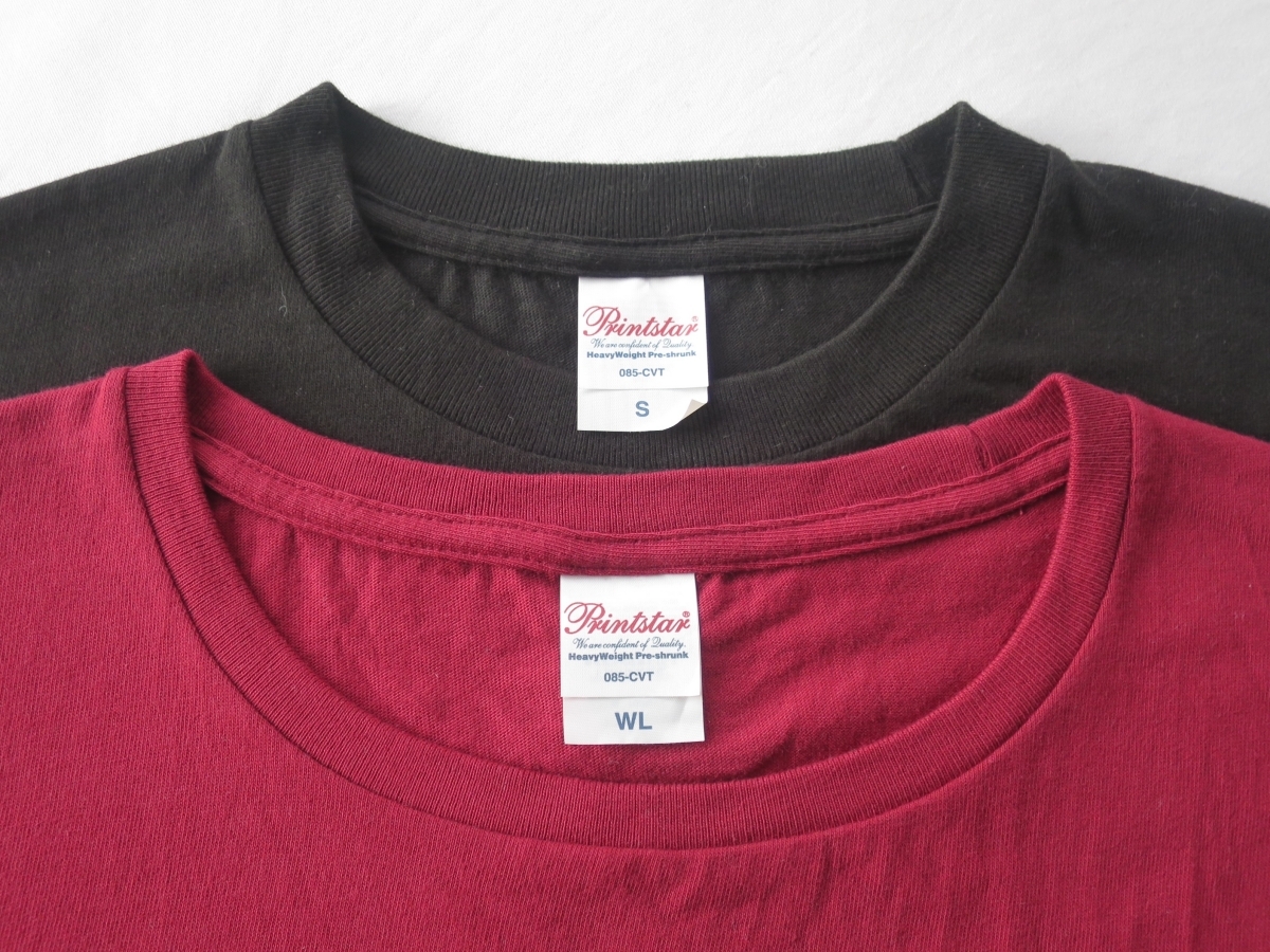 SサイズとWLサイズの襟元の比較はこんな感じです。WMとWL(レディースモデル)は襟ぐりが広めでリムが細い。ベースのTシャツはPrintstar(プリントスター)の5.6オンス綿100%085-CVTです。
