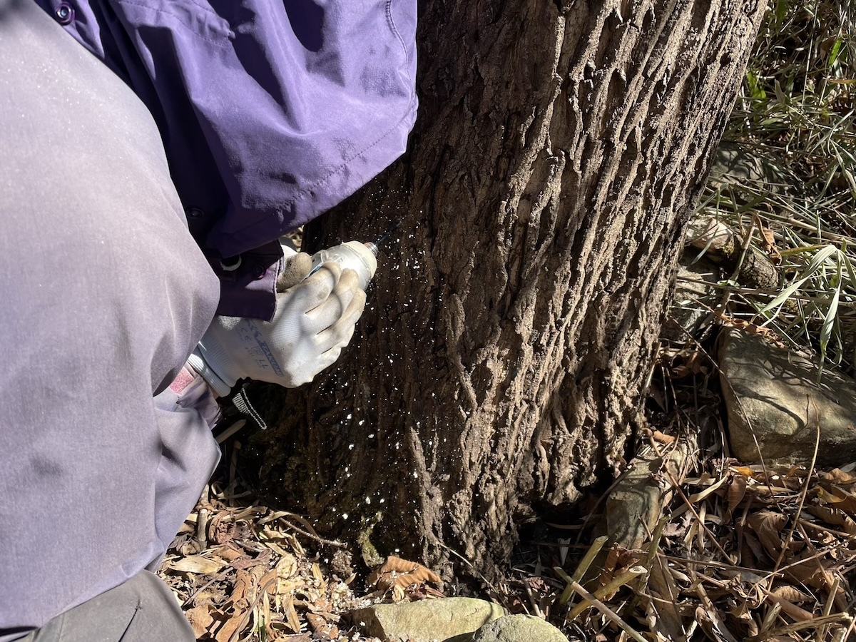エリソンの庭や周辺の河原に鬼胡桃の樹はたくさん生えています。この木は成長が早くてあっという間に大木になるんですよね。庭の中でなるべく太めの樹を選んでドリルで穴を開けます。深さは2〜3cmぐらい。