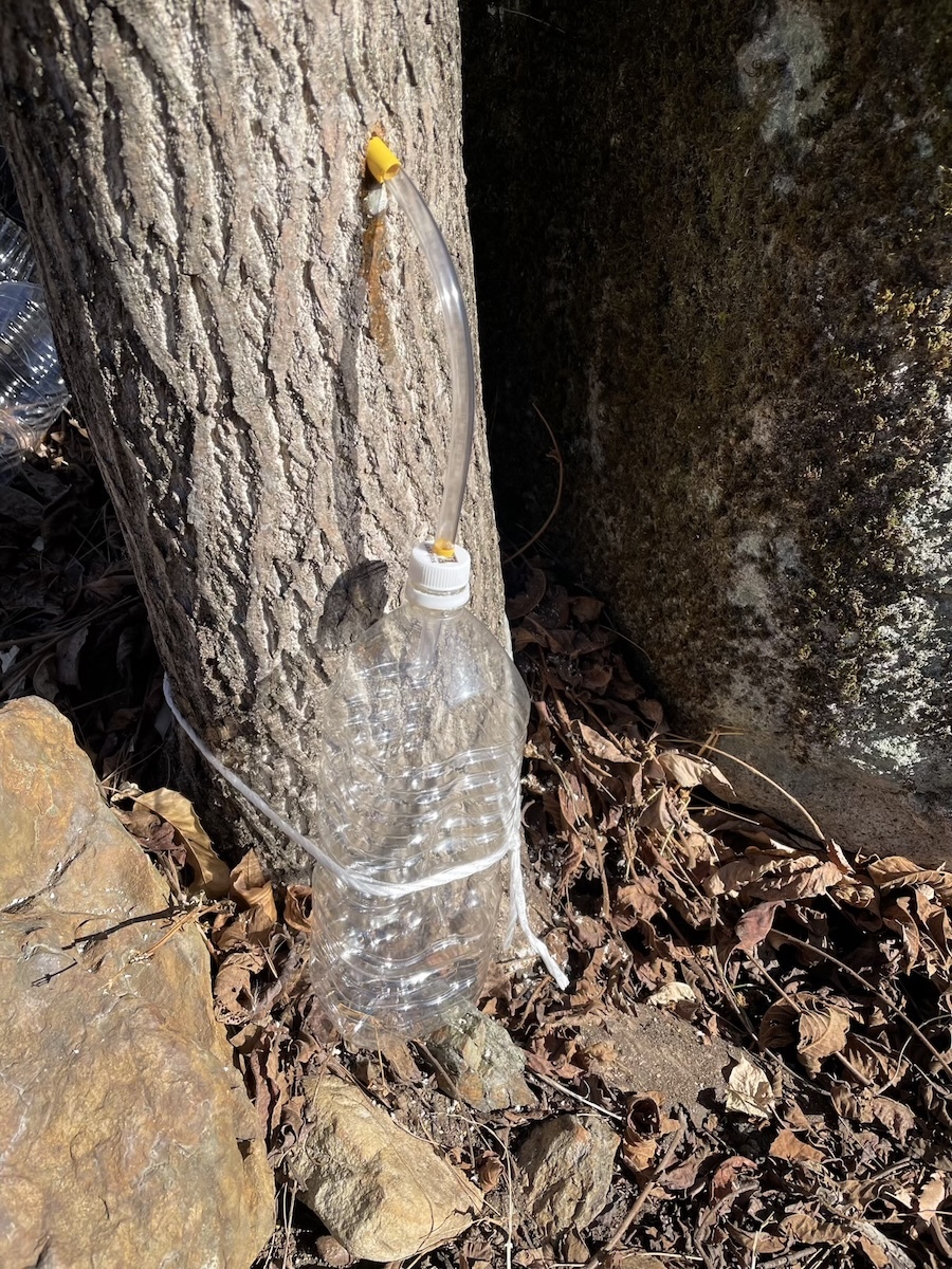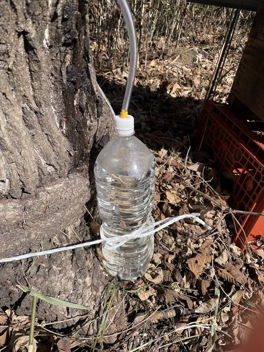 2時間で2Lがいっぱいになるほどの勢いにびっくり!他の樹はそれほどでもなく半日で1Lほどでした。味見をするとほぼ無味ですがうっす〜〜らと甘みを感じる。木の味などは感じないです。