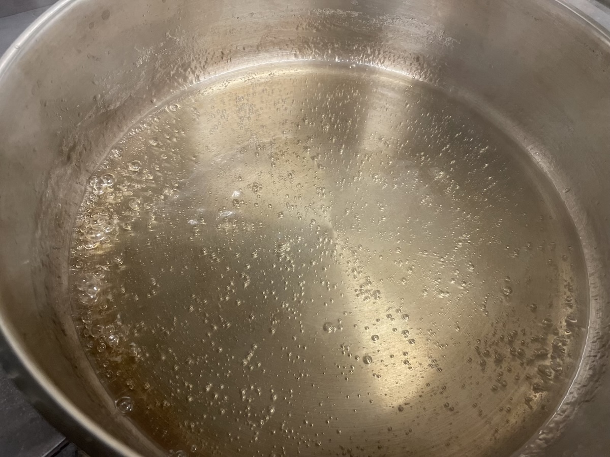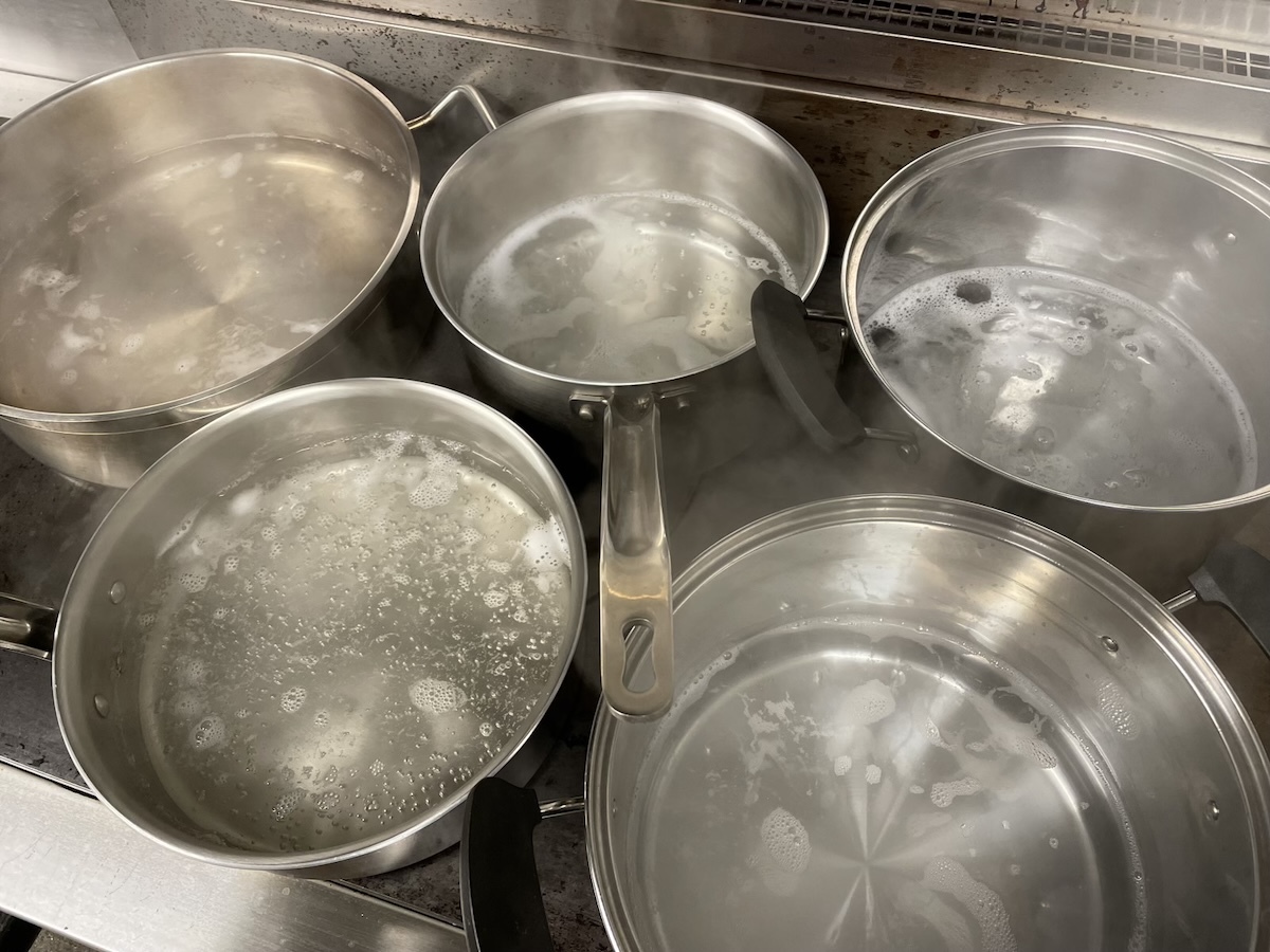 1日かけて何回かペットボトルの中身を集めていると1日で10L以上も集まりました。さて、翌日はこれを煮詰める作業です。蒸発をさせていかなければいけないのでなるべく沢山の鍋に分けて入れて火に掛けます。最初はぶくぶくとアクのような泡が出てくるのですくって取り除きます。