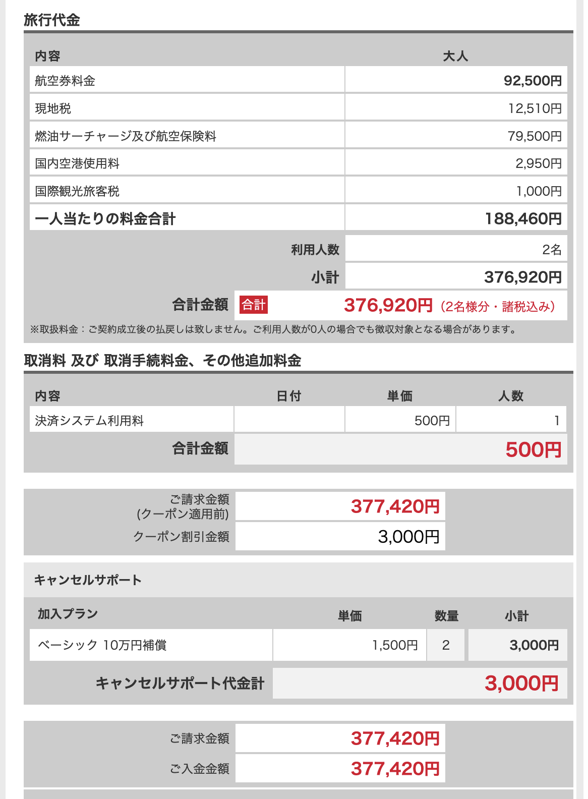 という訳で航空券はこんな感じ。上が当初の価格で下がサーチャージ確定後の価格。一人16万5千円なら思ったよりは安く買えたかも。
