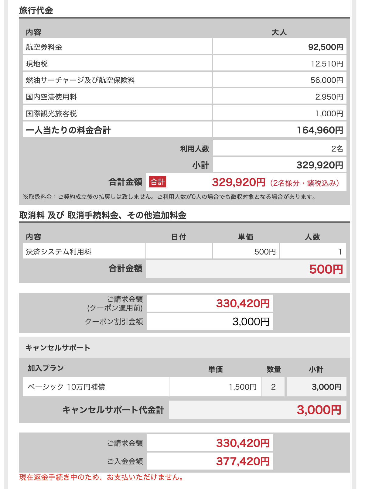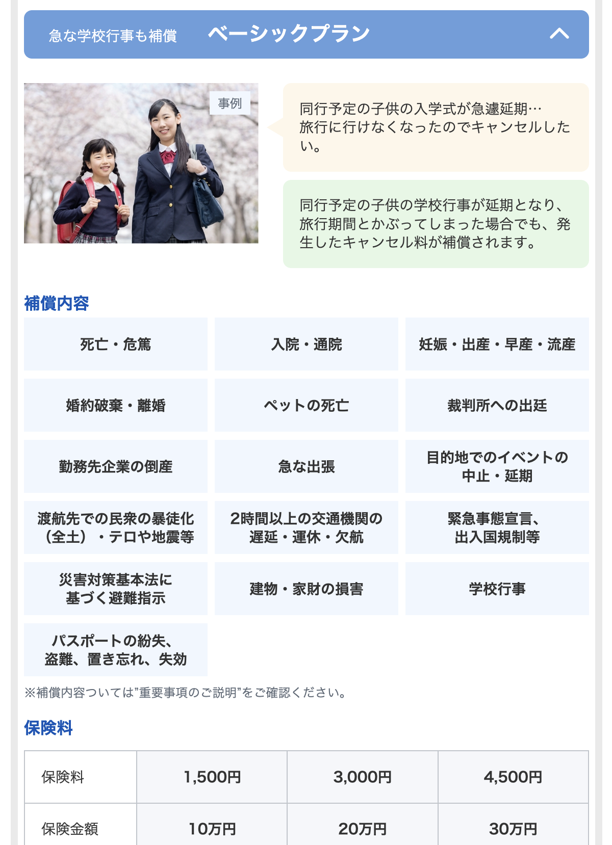 キャンセルサポート1500円ってのはサプライスのオプションで、特定のキャンセル理由ならキャンセル料の70%最大10万円まで補償してくれるもの。だいぶ先の予定だし何があるかわからないから一応付けてみた。補償対象になる理由はこんな感じ。
