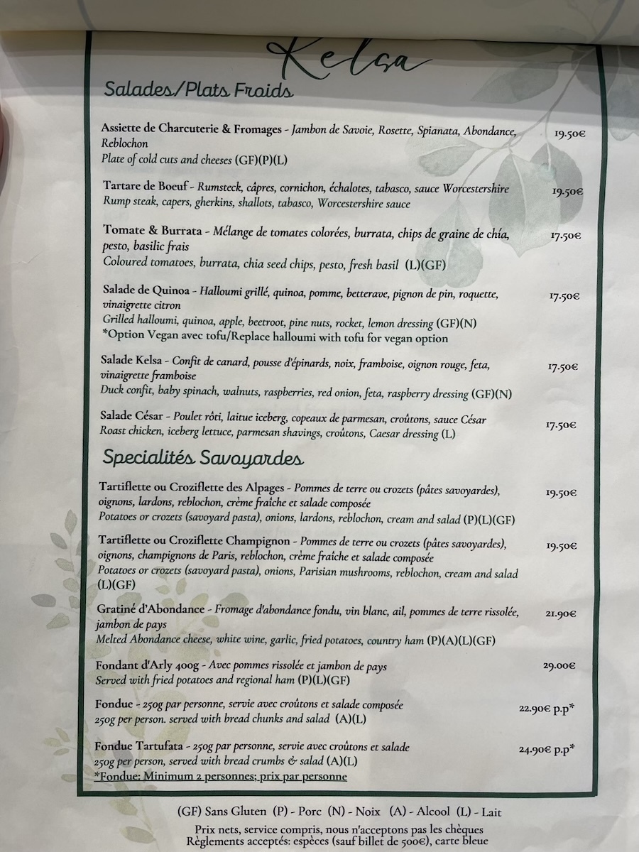 特にお店のあてはなかったので店先のメニューを見ながらお店を選ぶ。これがとても楽しい時間なのだ。アヌシーがあるサヴォワ地方はスイスやイタリアとアルプス山脈を挟んで国境を接していてほぼ同じような文化圏と言える。なのでサヴォワ料理はいわゆるスイス料理をイメージすると近いと思う。夕食の予定もあるし朝食も2回食べたし笑、昼食は軽めにと思ってこの地方の名物料理がサクッと食べられそうなカジュアルめのお店を選んで「Kelsa Bar & Restaurant」という店に入る。