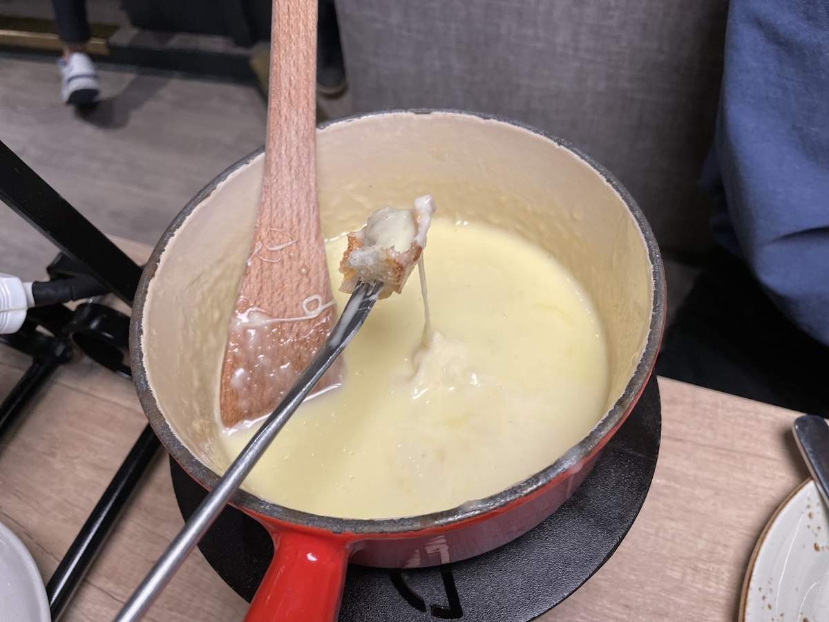 鍋でやってきたチーズフォンデュにもパンやジャガイモを絡めて食べる。本場のフォンデュは濃厚で美味しい〜
