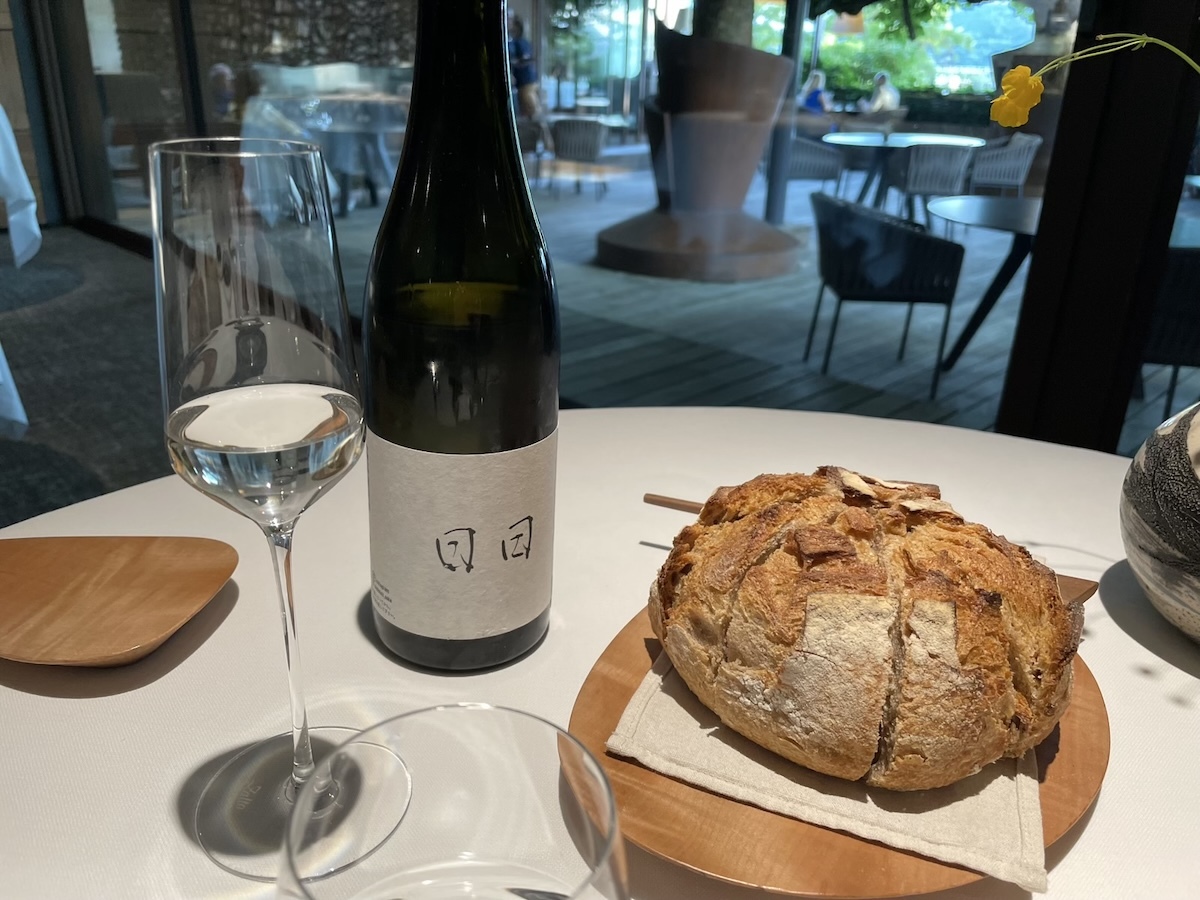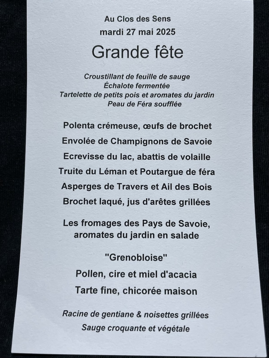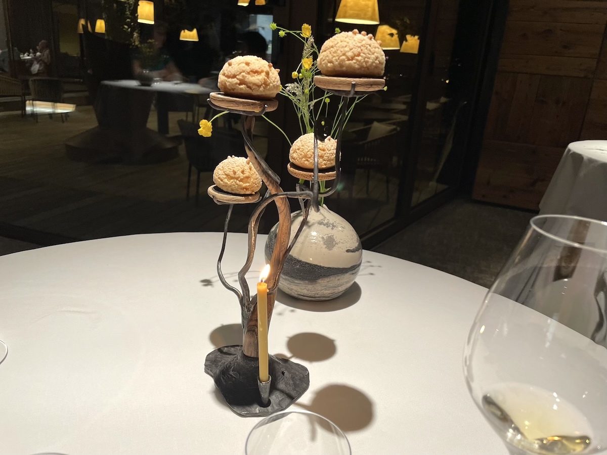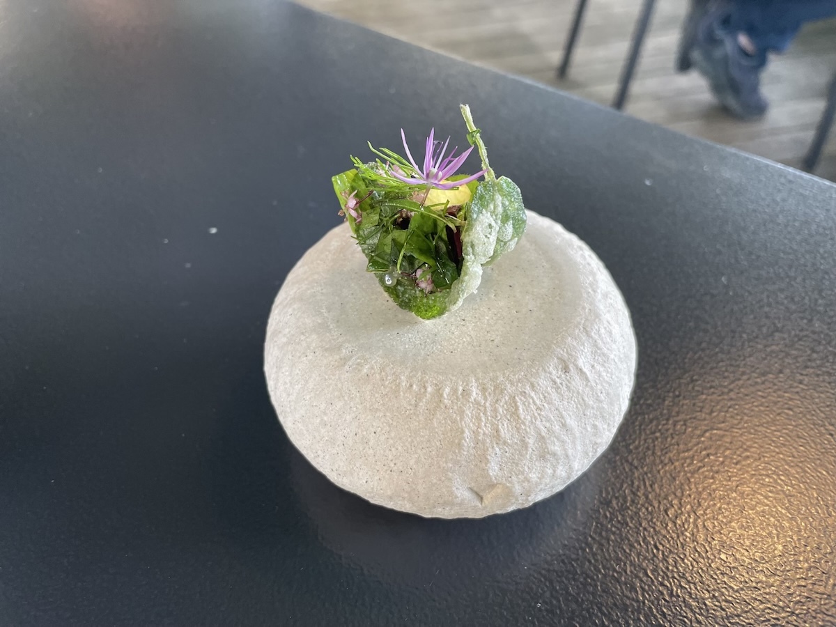 アミューズを何品かいただきながら今日のコースの食材リストを見せられて食べられないものがないか確認される。このレストランはコンセプトがはっきりしていて基本的に地元の野菜やハーブ類や野草類と淡水魚しか使わず海の物や肉類はほぼ出ないのだ。レストランの敷地に菜園もあり野菜やハーブ類はそこで栽培もしている。
