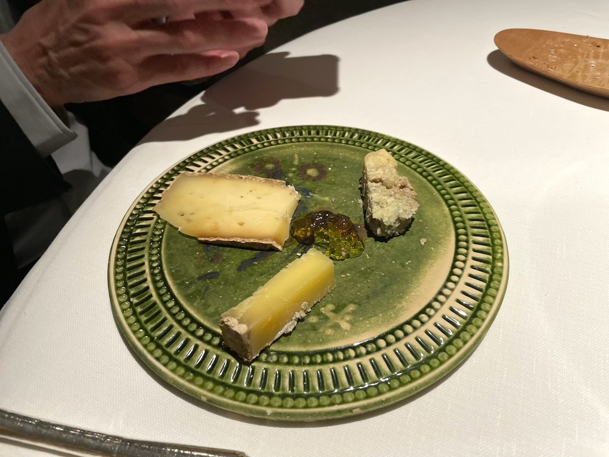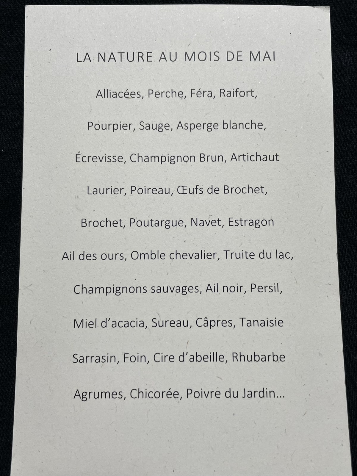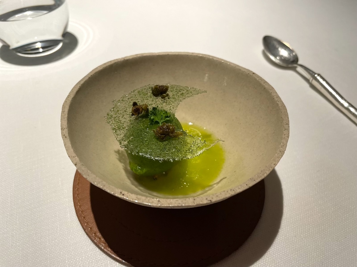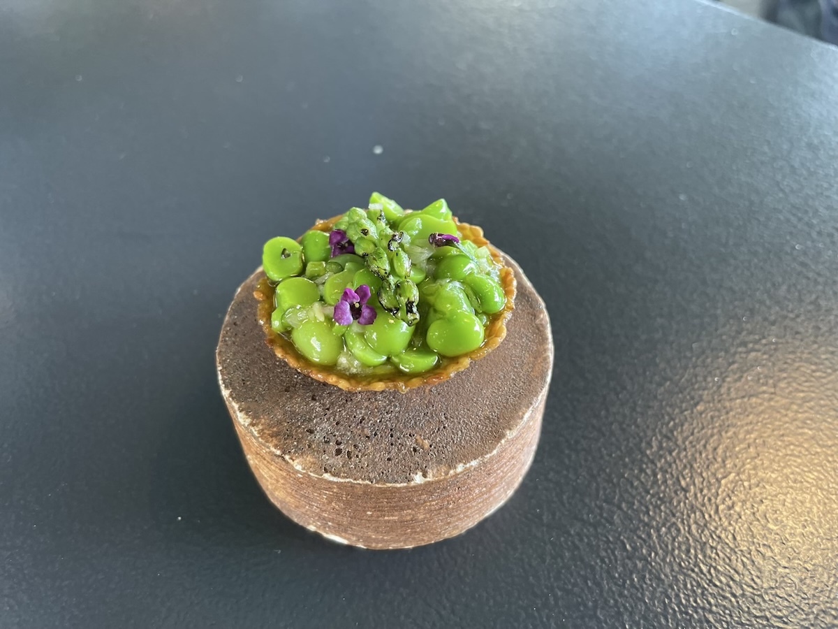 アミューズを何品かいただきながら今日のコースの食材リストを見せられて食べられないものがないか確認される。このレストランはコンセプトがはっきりしていて基本的に地元の野菜やハーブ類や野草類と淡水魚しか使わず海の物や肉類はほぼ出ないのだ。レストランの敷地に菜園もあり野菜やハーブ類はそこで栽培もしている。
