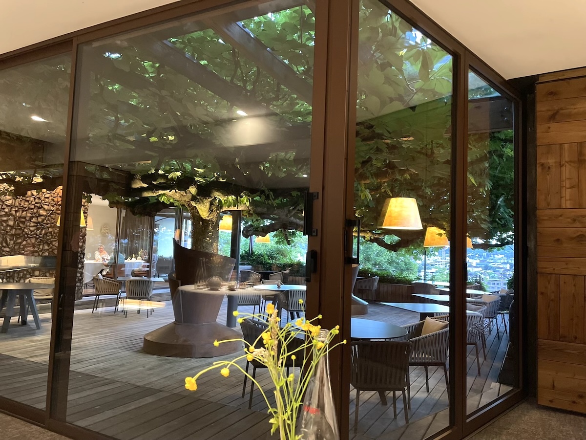 期待が盛り上がってきたところで店内に移動ししてお食事スタート。これはさっきまでいたテラスが見える店内からの風景。昼間は外のテーブルでもコースを出すんだと思う。