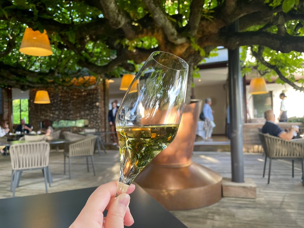レストランに出向きまずは先ほどとはまた違うテラスで食前酒。やっぱここはシャンパンだよね〜。