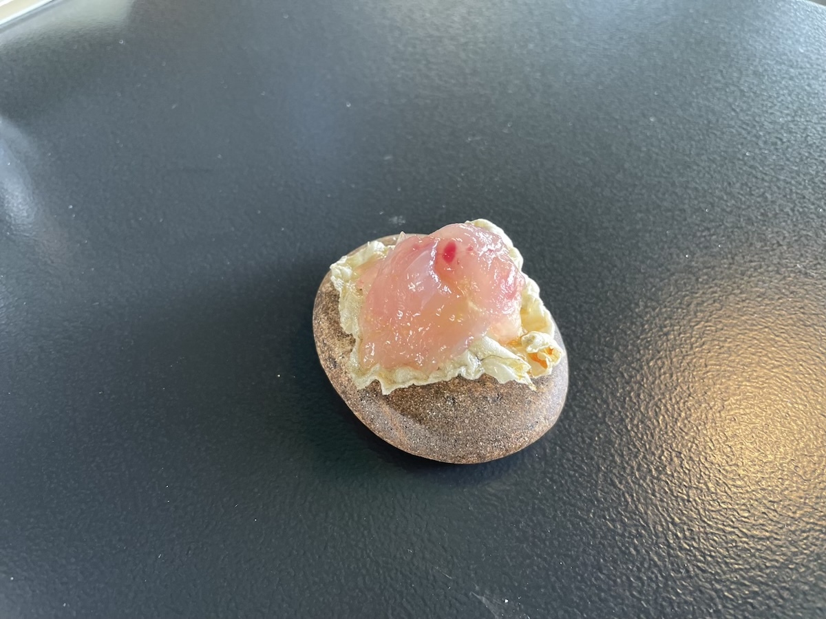 一杯目はなんと日本酒。一品目はカワカマスというフランスでは定番の大型の淡水魚の卵。生の魚卵に日本酒が合わない訳がない!