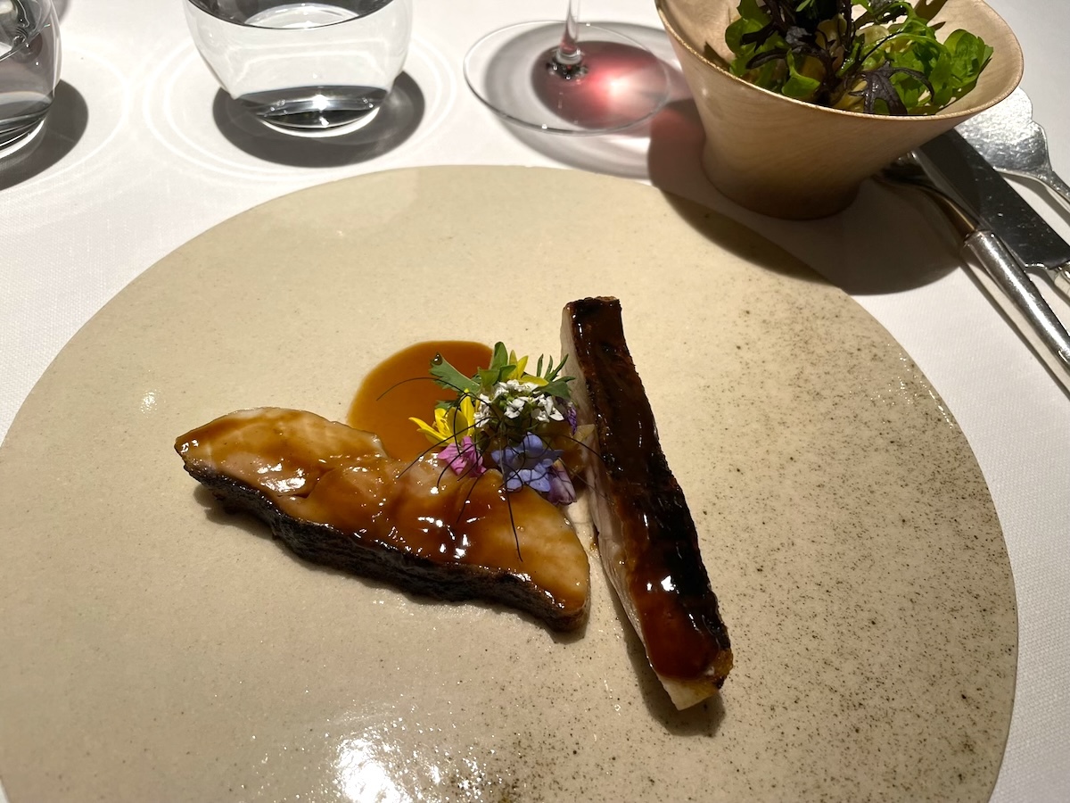 「Brochet laqué, jus d’arêtes grillées」鮮度の良いカワカマスを伝統的なラケで。どことなく照り焼き風。