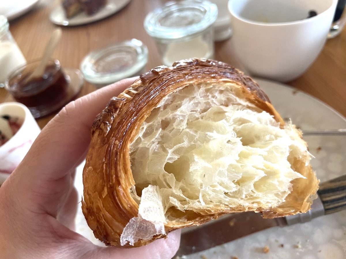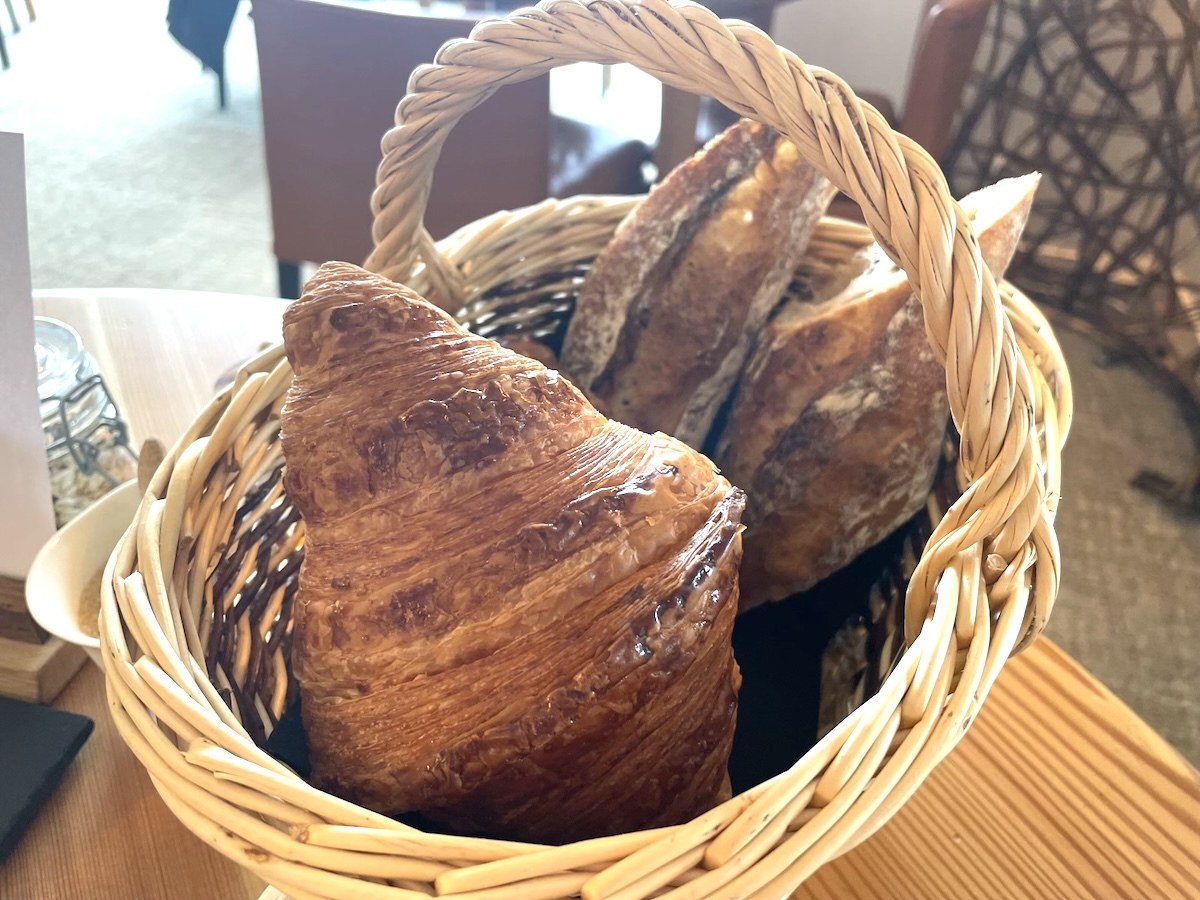 テーブルに所狭しといろいろ運ばれてくる。朝食の定番クロワッサンとバゲット。最高!