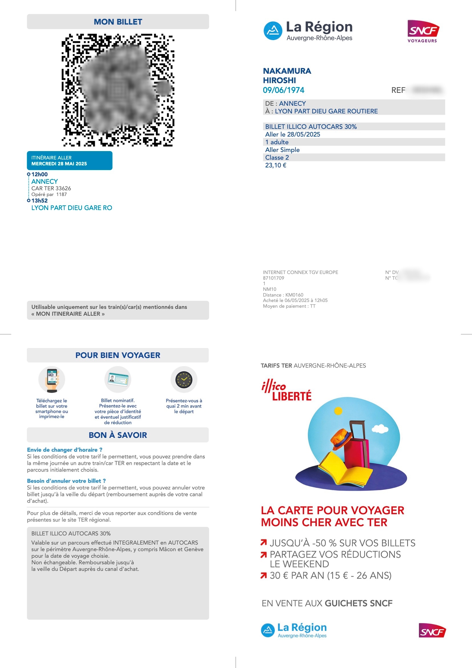 アヌシー駅の長距離バス乗り場(駅を背に右側)は出発バスの案内表示などもしっかりあってわかりやすかった。今日のバスはSNCF(フランスの国鉄)が鉄道の代替として運行してるバスだ。待っていると一台の大型観光バスが到着。特にSNCFの表示などもないけどこれで良いみたい。あんまチケットをちゃんとチェックすることもなくなんとなく荷物を積み込んでなんとなく予定通り12時に出発。バスの中は半分ぐらいの埋まり方だったかな。確かにこれでは列車を運行するほどではないのかもね。