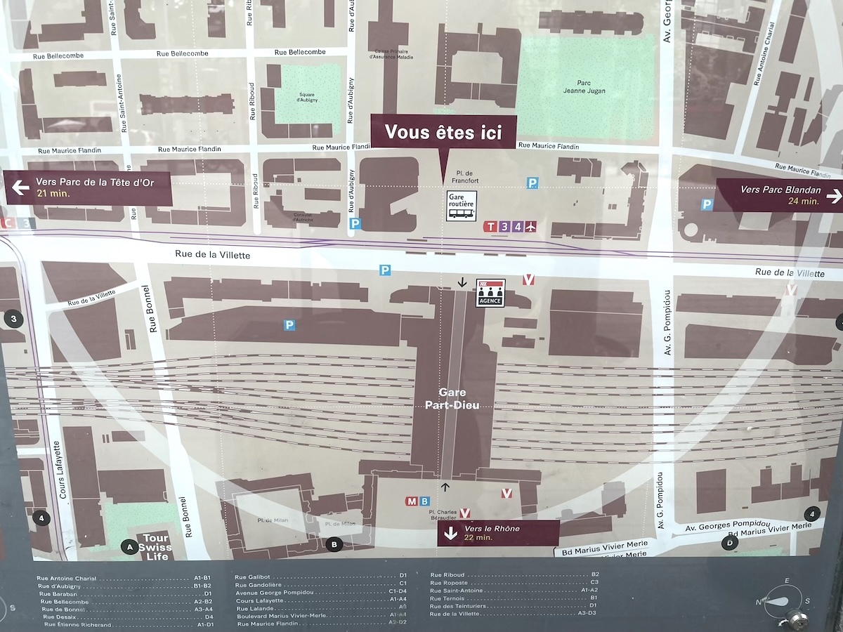 予定通り2時間ほどでリヨン・パール・デュー駅に到着した。駅の東側のバスロータリーに着いたので駅舎の中を通って西側に出る。