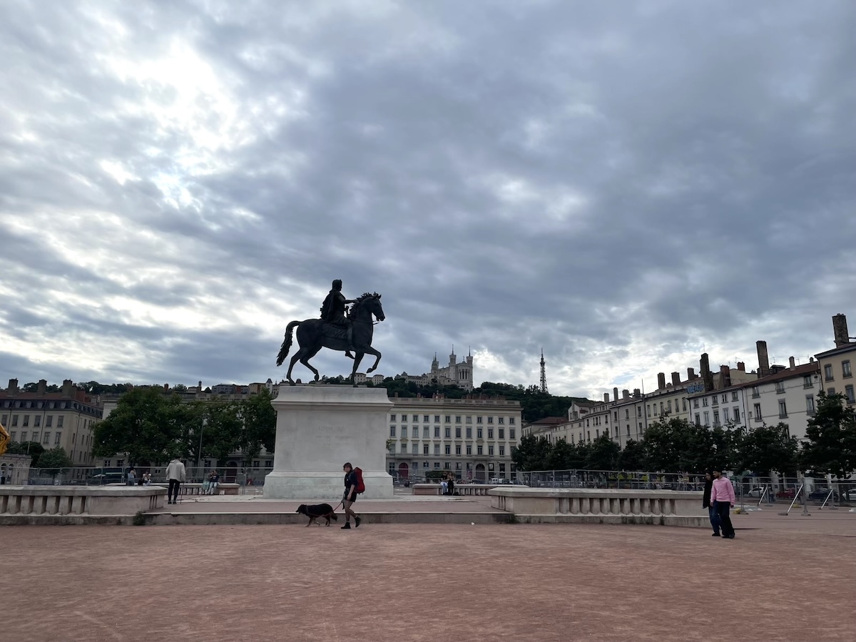 リヨンの中心にあるベルクール広場へ。四角くてめちゃくちゃ広い広場でいろんなイベントが開催される。この時も広場の半分はなにか建設中だった。広場の中央のルイ14世の銅像の向こうにはートルダム大聖堂。夏の長い長い夕暮れをしばしぼんやり過ごす。