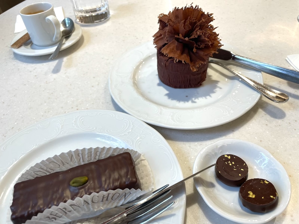 と、いう訳で他にいろんなケーキもあるんだけどチョコレートケーキを二つとコーヒーをオーダー(28.3ユーロ)。繊細というよりは力強いしっかりしたチョコの風味を味わえる。この店は日本人にもよく知られていて、食べている間にも何組も日本人のお客さんが訪れていたはさすが。食べたあとはもちろんチョコレートも購入。たくさん買いたいけどまだ先は長いので控えめに250gのいろいろ入っている箱を一つ。(35.65€)