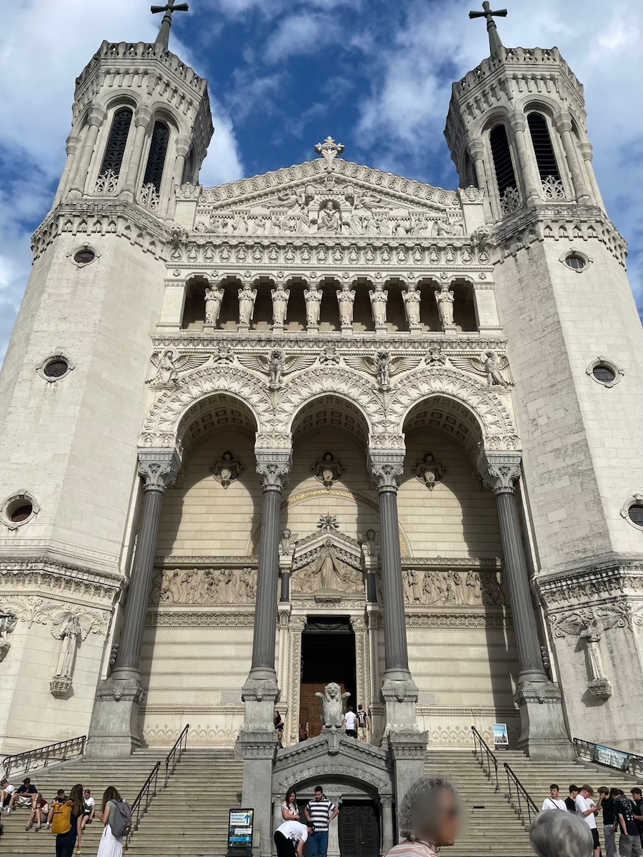 終点のケーブルカーの駅は地下にあり階段を登って外に出る。するとすぐ目の前に白亜のフルヴィエール・ノートルダム大聖堂がドーンとそびえていてなかなかびっくりする。この大聖堂は1800年代に作られた比較的新しいもので外観だけじゃなく中の装飾もとても豪華で素晴らしいんだけどこの時はミサ中で写真撮影はNGとのことだった。