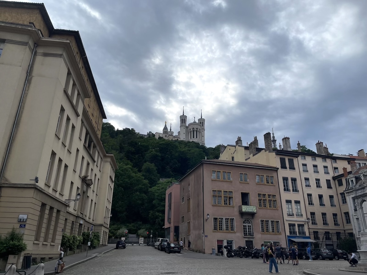 教会の前からフルヴィエールの丘を見上げるとこんな感じでノートルダム大聖堂が見える。