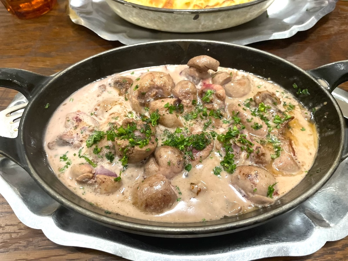 主菜は仔牛のロニョン(腎臓)のポートワインとマスタードのソース。鮮度が超重要なロニョンは日本ではなかなか食べられない食材。良い感じに火を通すとぷりぷりの食感で独特な風味がクセになる。これが小鍋にいっぱいと