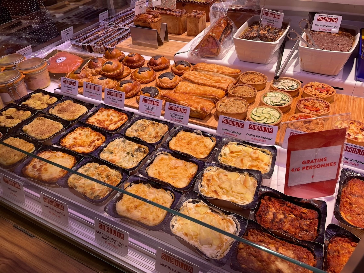 早速市場の中を見て回る。ワンフロアに通路が何本かありいろんな店が並んでいる。市場といっても全体的にキレイめでどことなくデパ地下風。リヨン中から厳選された店が並んでいるのでどの店を選んでも間違いないって感じ。パン屋、ケーキ屋、酒屋、魚屋、八百屋、肉屋、チーズ、シャルキュトリー(肉の加工品)、惣菜などなど。そのほかにレストランやカフェもある。