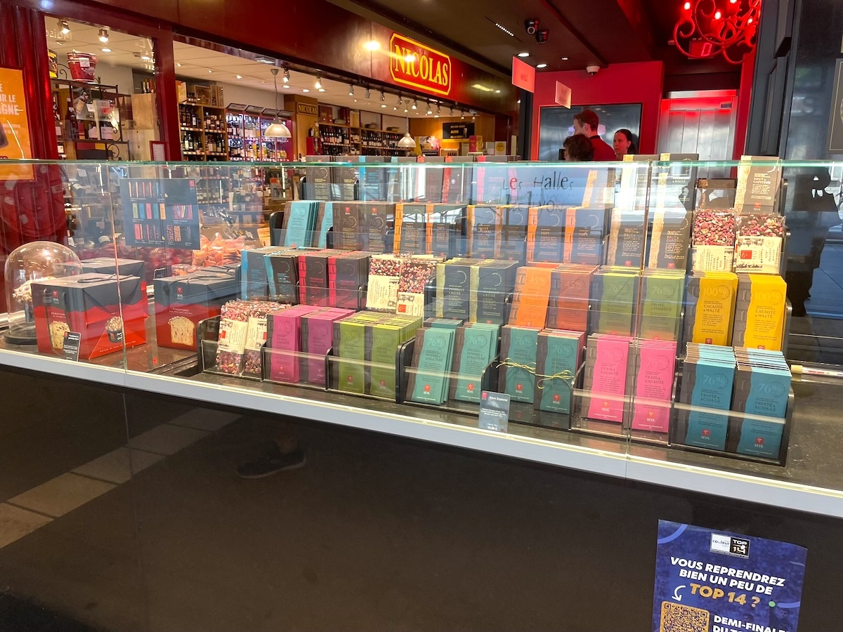 この「SÈVE」もビーントゥーバーのショコラトリーとして有名でケーキもすごく綺麗で美味しそう。でもケーキを食べる時間がないし午前に買ったらパリまで持っていけないしケーキは泣く泣く諦めてタブレットチョコ(板チョコ)を買った。カカオ豆から作ったタブレットチョコは一枚10€弱だけど3枚セットで19.9€だった。お得♪